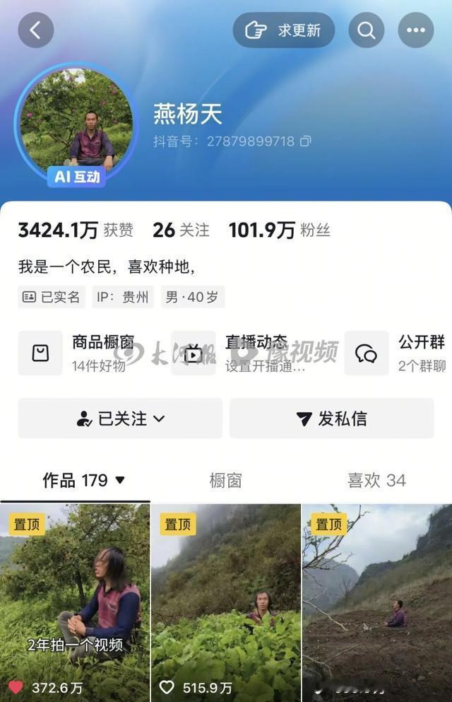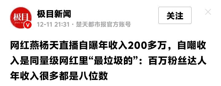 贵州六盘水“打坐仙人”燕杨天直播哭穷:年入200万自称“最垃圾网红”,百万粉丝博主背后竟藏八位数财富密码? 当多数人还在为每月几千块薪水奔波时,贵州六盘水的一位单亲爸爸却对着镜头自嘲年收入两百多万是“行业底层”。网红燕杨天在直播中轻描淡写晒出七位数收入,却反复强调自己是同量级博主里“混得最差”的一个。这究竟是凡尔赛式的谦虚,还是流量江湖里残酷的生存真相? 这位被称为“打坐仙人”的四十岁男人,靠拍摄植物生长视频走红。他将手机固定在田间,记录刺梨从发芽到结果的漫长过程,一条视频往往需要拍摄数月甚至一两年。这种近乎偏执的“时间魔法”,让他在短视频的喧嚣世界里开辟了一条寂静赛道。 燕杨天坦言收入几乎全靠平台流量分成,极少接广告。唯一一次推广是为了解燃眉之急。他说不愿让商业广告打断粉丝的观看体验,这份克制在急于变现的网红圈里显得格格不入。但也正因如此,他的内容保持着难得的纯粹质感。 月入几十万的高光时刻来自一条播放量破亿的视频。流量时代的财富逻辑如此直接——优质内容引爆关注,关注转化为真金白银。但燕杨天清醒地知道,这种爆发可遇不可求,更多时候他需要面对的是漫长等待与持续创作。 镜头外的他是贵州山区的单亲爸爸,抚养两个孩子,照顾七旬老人。四十岁的年纪让他意识到外出打工不再现实,于是把梦想扎根在故乡的土地上。从三年直播摸索到转型短视频,他用最笨拙的方式找到了属于自己的生存之道。 如今他不仅拍视频,还种植了三十亩刺梨,办起了加工厂。流量带来的不仅是收入,更是将家乡资源转化为产业的机会。这种“内容+农业”的模式,为无数农村创作者提供了可借鉴的路径。 燕杨天的故事撕开了网红经济的一角。当他说“同级别博主年入八位数”时,我们才惊觉这个行业的收入天花板如此之高。但高收入背后是极致的内容差异化和持续的内容耐力,这不是普通人能轻易复制的成功。 在这个人人皆可曝光的时代,燕杨天用最慢的创作赢得了最快的增长。他的成功提醒我们:流量红利仍在,但只垂青那些找到独特赛道并愿意深耕的人。而所谓的“行业底层”,不过是另一种形式的凡尔赛罢了。 贵州爆料 (来源:大河报·豫视频、极目新闻)