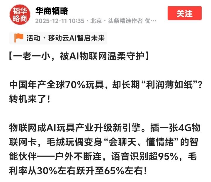 中国移动AI物联网“破局”实录:从玩具厂30%利润逆袭65%,到云南山村5000传感器守护独居老人,科技的温度正在颠覆你的认知! 当全球70%的玩具贴上“中国制造”的标签,背后却是工厂主们苦笑“利润薄如纸”的无奈。一个毛绒玩偶出厂价几十元,辗转至海外货架身价翻倍,而生产者仅分得残羹。但谁曾想,转机竟藏在一张指甲盖大小的物联网卡里? 插上4G物联网卡的玩偶,瞬间化身“智能伙伴”。它能听懂孩子的撒娇,识别超过95%的语音指令,甚至在外游玩时信号不断联。原本毛利率徘徊在30%的传统玩具,因注入AI灵魂,利润飙升至65%。这不仅是技术的胜利,更是中国制造向“中国智造”无声的宣示。 而在1600公里外的云南鲁甸,科技正以另一种姿态渗透生活。5000多个传感器悄然织就“数字安全网”,独居老人的翻身频率、厨房灶火状态、甚至心跳异常,皆被精准捕捉。系统秒级预警,照护效率提升50%,风险直降20%。没有冰冷的机器轰鸣,只有生命被温柔托底的安稳。 从玩具工厂到偏远山村,中国移动的“端-边-云”全栈能力,悄然重塑着生活的维度。连接不再只是信号格满格,而是读懂孩子笑声里的期待,化解老人独坐时的忐忑。科技的本质,从来不是炫技,而是填补那些曾被时代忽略的缝隙。 网友热议背后,是普通人最真实的渴望。有人调侃AI客服“听不懂人话”,有人渴望养老机器人落地,更多人则在感叹:“一老一小,竟被科技同时温柔拥抱。”这些声音拼凑出的,正是时代变革中大众的欣喜与彷徨。 但争议亦是进步的催化剂。当AI玩具被质疑“是否剥夺孩子想象力”,当传感器被忧虑“是否侵犯隐私”,我们更应看清:工具本身无善恶,唯人心决定温度。科技的意义,在于让人回归人——让生产者有尊严地盈利,让弱者有底气地生活。 回头看,玩具利润的跃升与老人风险的下降,本质是同一件事:通过连接,让资源流向最需要被照亮的地方。中国移动云以“九天”大模型为底座,赋能政务、医疗、乡村,其内核始终是“由云向智”的战略清醒——技术必须扎根泥土,才配称为进步。 或许未来某天,AI不再只是“热点”,而是像空气一样寻常的存在。但今天,请记住这些瞬间:孩子抱着会说话的玩偶眼睛发亮,老人看着传感器安心微笑。科技的灵魂,终究是人性照进的微光。 (来源:综合中国移动物联网案例、行业调研数据及网络社会热议) 科技温度 Al民生 物联网革命 ai移动云 物联网