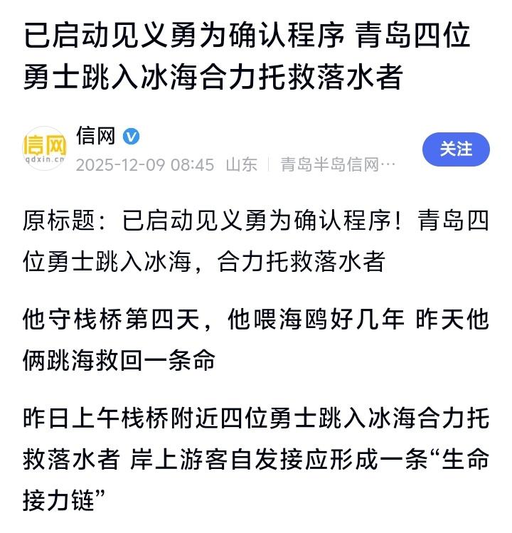 青岛栈桥生死时速!零度冰海里四条汉子肉身搭“人梯”,托起90公斤昏迷壮汉!全网寻找无名英雄 海风像刀子一样割在脸上,海水冷得刺骨。12月8日上午的青岛栈桥,百年风景地标前,时间仿佛凝固。一个身影在海浪中沉浮,生命随着冰冷的波涛一点点流逝。那一刻,没有犹豫,没有豪言,四道身影从不同方向,纵身跃入那片噬骨的寒冰之中。他们是谁?是什么让他们在寒冬里,为陌生人赌上一切? 栈桥上,游客的惊呼还未落下,救援已本能地开始。最先跳下的,有常年在栈桥直播、被网友叫作“栈桥鸥爸”的李视昌。他当时正举着手机,向屏幕另一头的粉丝展示海鸥翩飞的日常。呼救声撕裂了平静,他扭头一看,手机和车钥匙往旁边摄影师手里一塞,人已经冲了出去。日常的守护者,在这一刻化身为决绝的施救者。 几乎同时,栈桥入口处,一个高大的身影如箭离弦。他是郭少臣,景区新上任第四天的保安队长。军人的本能让他对“危险”信号有着超乎常人的敏锐。狂奔,扒住桥沿,纵身一跃,动作一气呵成。4米的高度,水下是狰狞的礁石,他眼里只有那个逐渐无力的落水者。他说,救人是一种“条件反射”。 海水瞬间浸透厚重的冬衣,夺走体温,增加着难以想象的负重。落水者是一位身高一米八、体重近90公斤的壮汉,因呛水已陷入昏迷,软绵无力。这不是救援,这是在和物理法则、和死神角力。先下水的热心市民体力在急速消耗,郭少臣和李视昌迅速加入,四人没有任何交流,却瞬间形成了默契。托举、拖拽,在齐胸深的海水里,用血肉之躯筑起一道移动的“人梯”。 力量在冰冷中一点点流失,每前进一米都无比艰难。刺骨的海水让肌肉僵硬,呼吸变得灼热。但他们咬紧了牙关,心中只有一个滚烫的念头:上去!必须把人带上去!这份沉默的坚持,比任何口号都更有力。它源自人性深处最朴素的善,是对生命无条件的敬畏。 岸上,一幕同样动人的场景正在发生。栈桥的游客和市民自发地聚集起来,他们伸出手,焦急地等待着。当四位勇士艰难地将落水者托近台阶时,无数双手从上方伸了下来。搀扶勇士,接应伤者,传递温暖。一条自发的、无声的“生命接力链”在冬日的栈桥上瞬间结成。这一刻,没有陌生人,只有共担危难的同胞。 落水者被成功救上岸!李视昌立即运用急救知识让他侧卧,海水从口鼻中涌出。直到救护车的鸣笛声响起,紧绷的弦才稍稍松开。这时,勇士们才感到透心的冷,才发现手脚被锋利的牡蛎壳划破,鞋子早已破烂不堪。郭少臣默默换了身干衣服,又回到了巡查岗位;李视昌拿回手机,才看到近800名网友在未中断的直播间里,为他刷满了“英雄”的留言。 事后我们才知道,郭少臣曾是一名服役20年的海军老兵,守护是他的天职;李视昌是热爱家乡的普通市民,他的直播镜头里装满了对青岛的爱。身份不同,却在那生死一瞬做出了相同的选择。这选择,照亮了平凡人的英雄底色。市南区已启动见义勇为确认程序,这是对善行最郑重的致敬。 然而,我们至今还不知道另外两位无名英雄的名字。他们可能是一位路过的大哥,一位普通的游客,救完人后悄然离开,湿漉漉地消失在人群里。他们是谁?我们迫切地想找到他们,补齐这幅壮美群像,让这份感动更有姓名。如果您认识他们,请一定告诉我们。 这个寒冬,青岛的海水很冷,但人心很烫。四位勇士用最果敢的行动告诉我们:英雄从未远离,他们就在我们中间。每一次无畏的托举,都在定义着这座城市的温度;每一个默默的身影,都是文明最坚实的注脚。这份感动,值得被看见,被铭记,被传递。 (来源:综合观海新闻、青岛晚报、掌上青岛及现场目击者采访) 青岛 栈桥 生死时速 四勇士救壮汉 见义勇为 凡人英雄 正能量