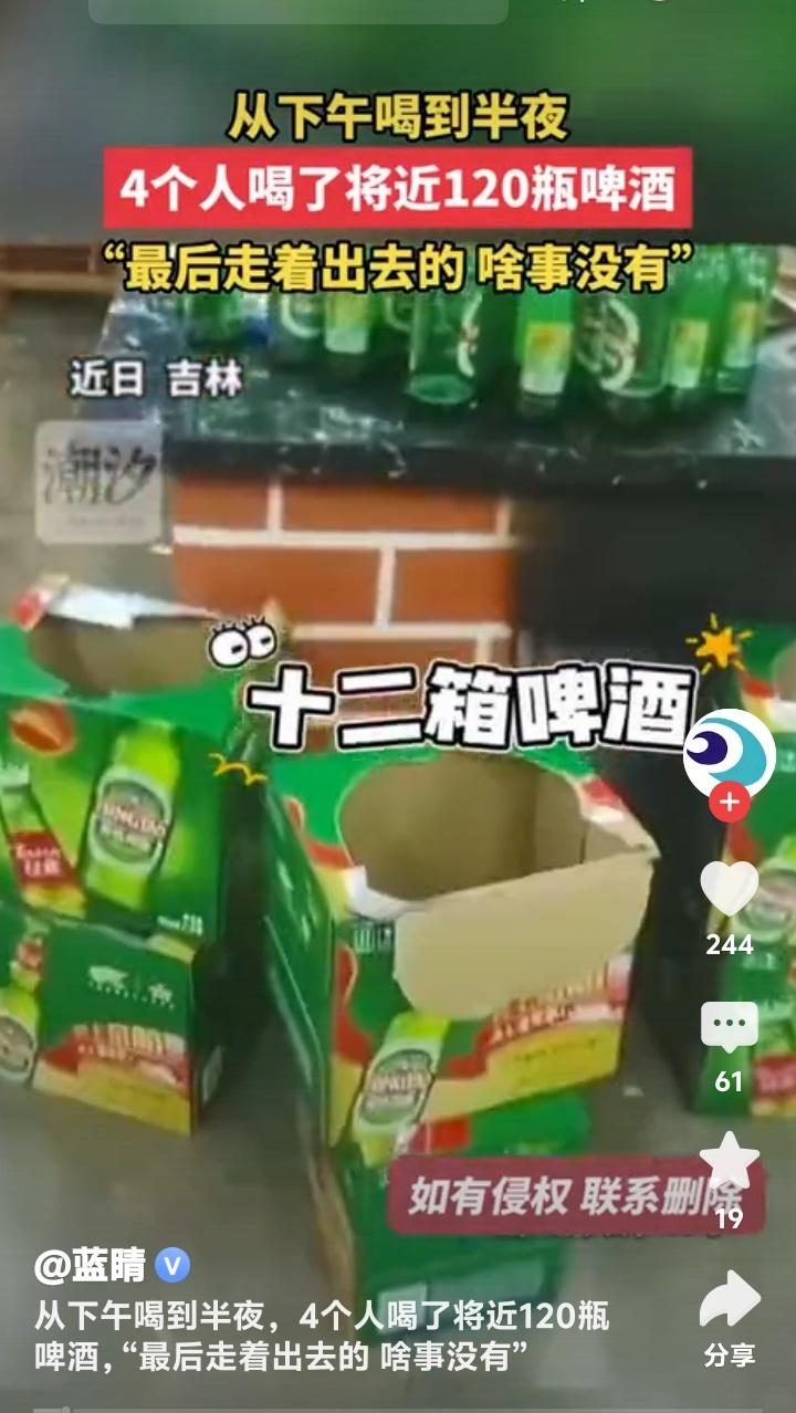 吉林饭店奇观!四个男人七小时狂饮十二箱青岛啤酒,老板搓手看傻眼,网友炸锅:这是把酒喝成了凉白开? 那晚的吉林街头寒风刺骨,可一家寻常饭店里却热火朝天。四个中年男人从日头西斜坐到深夜,桌上空瓶堆积如山。整整十二箱青岛啤酒,近一百二十瓶,被他们一滴不剩地喝完。最让老板目瞪口呆的是,结账后四人竟神色如常,自己推门走入夜色。这一幕被记录下来,瞬间点燃网络。 视频在各大平台疯传,评论区彻底炸了。有人惊呼这是“海量”,有人质疑“水里掺了酒”,更有无数网友晒出自己的“辉煌战绩”比拼。一场关于酒量的全民大讨论,就这样被一桌酒瓶轻易引爆。但喧嚣背后,我们真正该看的,究竟是什么? 首先戳破那个“神话”。东北常见的啤酒酒精度往往在3度左右,远低于许多南方品牌。十二箱听起来吓人,但若细算总酒精量,分摊到七个小时和四个人头上,并非不可完成的任务。身体每小时能代谢一定量的酒精,只要摄入速度不超过代谢速度,保持清醒就不足为奇。 关键或许在于“怎么喝”。这绝非一场速战速决的比拼。长达七小时的宴饮,大部分时间可能在畅谈、吃菜、间歇举杯。这种“慢酒”文化,给了身体充足的代谢时间。它不像一口闷的急酒那样猛烈冲击神经,而是细水长流。所以,他们喝下的不仅是酒,更是时间。 网友的激烈反应恰恰折射出一种普遍心理:我们对超越日常认知的事物,第一反应常是怀疑与解构。当“酒量神话”被拆解成度数、时长、代谢这些冰冷数据时,那份震撼便打了折扣。我们乐于围观传奇,却又忍不住亲手把它拉下神坛,这本身就很耐人寻味。 更深一层看,这场饮酒已超越口腹之欲,成为一种社交表演。在注重“酒桌气场”的语境下,能喝、敢喝常被与豪爽、义气挂钩。点下十箱酒的瞬间,某种“面子”与“气势”已然达成。围观者的惊叹,老板的不可置信,都成了这表演最即时的掌声。 然而,所有讨论都绕不开健康这门必修课。无论代谢能力多强,超量酒精对肝脏、神经系统的累积伤害是科学事实。年轻时或许能“扛”,但代价可能在多年后显现。那些评论里“当年勇”的故事,往往也带着“如今戒了”的唏嘘。这无疑是最沉重的警示。 事件中的老板心态值得玩味。从担心闹事劝阻,到震惊围观,其态度变化也是社会观念的缩影:对饮酒量既有一种潜意识的推崇,又夹杂着对失控的担忧。这种矛盾,正是酒文化复杂性的体现。 说到底,吉林这顿酒之所以爆火,是因为它像一个多棱镜,照出了社交心理、地域文化、健康观念和网络时代的传播逻辑。我们争论酒的真假,探讨喝的技巧,回忆自己的青春,最终在喧嚣中各取所需。 它提醒我们,有时“神话”就藏在日常里,只需一点计算和洞察就能看清本质。更重要的是,无论酒量深浅,懂得节制、珍惜健康、享受真正的情感交流,或许比任何“神话”都来得可贵。酒终会醒,路还要自己清醒地走下去。 (来源:根据@后浪视频、@蓝睛及网络热议内容综合撰写) 酒量真相 健康警钟 社交心理