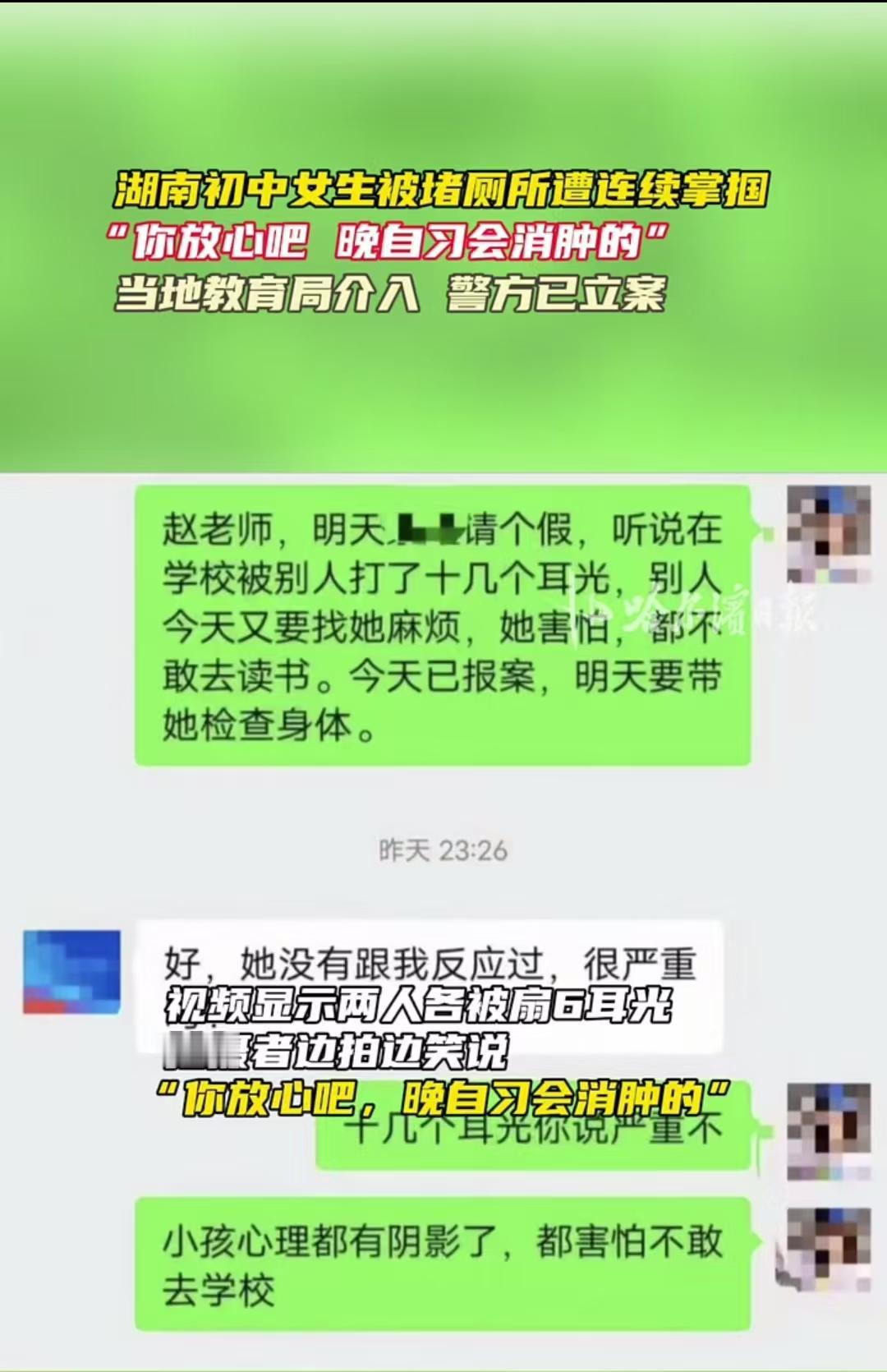 湖南,两名同学不敢上课,躲在厕所哭泣,是因为他们被一群同学掌掴。两人既不敢告诉老师,又怕遭到施暴者报复,直到事发八天后,这件事才被父母发现。父母带着孩子到学校后,老师却对此毫不知情——因为从来没人向老师吐露过这件事。受害方家长在学校协调下与施暴学生的家长碰面,后明确拒绝和解,决定依法处理此事,绝不让步。 2025年12月1日下午,湖南衡东洣水实验中学的生物课正在上课,讲台上的老师专注写着板书,初二女生小邓却坐立难安。 前几天她在短视频平台发布视频后,陌生的初三学姐龙某在评论区辱骂自己,小邓将其拉黑后,总担心对方会找机会报复。期间有同学叫她和小罗去二楼厕所,两人一进去就被龙某带着外校的文某,还有七八个同学堵在了门口,手机镜头一下对准了她们。 “拉黑我是吧?今天就让你知道后果。”龙某的声音冷冰冰的,话音刚落,巴掌就狠狠扇在了小邓脸上。 “啪——啪——”一声接一声的脆响,在狭小的厕所里绕来绕去。小罗想上前拦,也被文某反手扇了一巴掌。 施暴的人先打了几下发现没录视频,又重新开机拍摄,边打边数,俩人各挨了六下,嘴里飘出那句让人心里发寒的话:“你放心吧,晚自习会消肿的。” 门口的同学有的低头围观,有的拿着手机拍摄,没一个人站出来说一句“别打了”。施暴者打完后还在厕所内抽烟,限制两人离开,整个围堵过程持续了约20分钟。 冰冷的瓷砖墙贴着小邓的后背,她捂着火辣辣的脸,眼泪混着委屈往下掉,只觉得那20分钟的时间,过得比一天还慢。 这巴掌带来的疼,远不止脸上的红肿。俩人怕脸上的巴掌印被老师发现,整节生物课都没敢回教室。下课后溜回座位时,还有同学调侃小邓“耳光吃饱没”。 接下来的八天,小邓和小罗天天活在恐惧里。她们不敢跟老师说,怕龙某变本加厉;不敢跟家长讲,怕遭到更严重的报复。 上课总走神,一听见厕所门响就浑身发抖,甚至不想上学,饭也吃不下几口。 直到12月9日,有同学带话给小邓,说龙某和文某当晚可能还要找她麻烦,小邓因极度害怕哭着向家长求助,这件事才终于浮出水面。 家长赶到学校时,老师却一脸懵——他们压根没发现,小邓和小罗在12月1日的生物课上,整节课都没回教室。 更让家长生气的是,外校的文某能随便进学校,学校的门禁跟没设一样。 报了警之后,衡东县公安局于12月10日出具《行政立案告知书》,正式对此案行政立案,教育局的调查组也到了学校,龙某被休学处理。 可当被打的视频在网上传开,小邓刷到那些看热闹的评论时,还是躲在被子里哭。 她想不通,只是不想听辱骂的话,为什么要遭这样的罪?校园本该是最安全的地方,怎么会变成让她害怕的角落? 校园里的暴力从来不是“小孩间的打闹”,它是厕所隔间里的巴掌,是旁观者的沉默,是管理漏洞里钻进来的寒风。 而我们真正该做的,是给这些孩子撑一把伞,让校园的每个角落,都能晒到暖和的阳光。 一、仅因“被拉黑”就动手掌掴,凸显部分未成年人暴力行为的随意性与危害性 新修订《治安管理处罚法》:以殴打、侮辱等方式实施学生欺凌,违反治安管理的,公安机关应依法给予治安管理处罚,14至16周岁屡教不改者可执行拘留。 施暴者把“被拉黑”这点小事当成打人借口,核心是法治意识太差。法律里的处罚规定,就是为了管住这种“一点矛盾就动手”的行为,划清未成年人的行为底线。 二、受害女生遭掌掴后隐瞒八天,体现校园欺凌受害者的沉默困境 《未成年人保护法》第十一条:任何组织或个人发现侵害未成年人权益情形,有权劝阻、制止并向相关部门检举控告;密切接触未成年人的单位发现危险情形,应立即报告。 孩子不敢说,一是怕施暴者报复,二是怕说了之后没人管。法律虽然要求学校、相关部门有报告和保护的责任,但这些规定没落到实处的话,孩子就只能把委屈憋在心里。 三、近十名同学围观掌掴却无人制止,反映校园内见义勇为行为的稀缺性 《民法典》第一百八十三条:因保护他人民事权益使自己受到损害的,由侵权人承担民事责任,受益人可以给予适当补偿;没有侵权人、侵权人逃逸或者无力承担民事责任,受害人请求补偿的,受益人应当给予适当补偿。 围观的同学不敢站出来,就是怕自己惹上麻烦。法律其实给见义勇为的人撑腰了,明确了补偿规则,但学校没教过大家遇到这种事该怎么安全帮忙,学生自然不敢贸然行动。 对于此事,大家如何看待?素材来源于哈尔滨日报,2025年12月11日