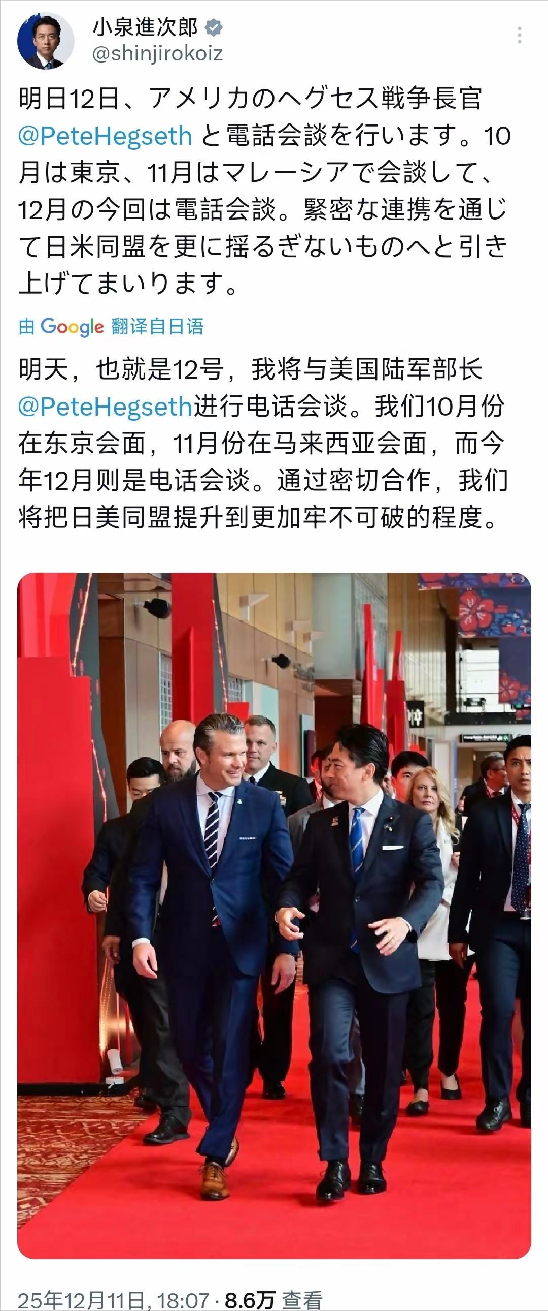 日本防卫大臣突然间发文! 日本防卫大臣小泉进次郎在12月11日晚发文:“明天,也就是12号,我将与美国战争部长赫格塞斯进行电话会谈。我们10月份在东京会面,11月份在马来西亚会面,而今年12月则是电话会谈。通过密切合作,我们将把日美同盟提升到更加牢不可破的程度。” 日本现在是真的急,前脚刚跟英国、意大利敲定2035年前共同研发下一代战机的“全球空中作战计划”,三国凑钱组局搞军工合作,日本还主动要当初期领导者,这可是二战后它在美国之外搞的首个重大防务工业项目,着急拓展朋友圈的心思昭然若揭。 后脚就赶紧跟美国刷存在感,三个月内跟美国防长见三次面,频率比亲戚走动还勤,说白了就是一边拉着欧洲盟友壮胆,一边死死抱住美国大腿,生怕在大国博弈里落了单。 而小泉进次郎这波高调操作,背后也藏着不少个人算盘,这位前首相小泉纯一郎的儿子,2025年10月刚接任防卫大臣,之前败选自民党总裁,正急需靠政绩“补课”,上任不到两周就密集出访、频繁发推,在东南亚防长会议上主动拉着美国防长、韩国防长合照抢镜,一口气跟八国防长单独会谈,满世界喊“印太团结”,无非是想把“温和环保派”的旧标签撕了,贴上“强硬实干派”的新标签,为下一次冲击首相宝座铺路。 这次深夜发文预告通话,说白了就是场政治作秀,既秀了日美同盟的亲密,又刷了自己的存在感,一举两得。 可这急吼吼的操作,其实满是破绽,国内53.6%的国民反对增加防卫费,只有39%的人赞成,在野党更是痛批这是“毁掉国民生活的战后最差预算”,巨额防卫开支靠发国债填补,不仅挤占了医疗、育儿的财政投入,还得让子孙后代背着债务包袱。 更有意思的是,它拉着欧洲盟友搞战机研发,却面临着装备出口限制的难题,想出口第三国还得修改现行规则,能不能成还两说;跟美国绑得越紧,就越难保持自主性,《朝日新闻》都警告,这种贸然加深日美一体化的做法很危险。 在地区层面,日本的急功近利只会加剧紧张局势,它借着“应对中国”的名义,在东南亚拉拢盟友、搞联合演习,却没料到马来西亚总理安瓦尔当面就提福岛核污染水排海的问题,要求它听取地区国家关切,可见不是所有国家都愿意跟着它起舞,周边国家对它突破“专守防卫”的举动早就高度警惕,它越是急着扩军、搞同盟捆绑,就越容易引发军备竞赛,把地区安全局势推向危险边缘。 说到底,日本的“急”,是野心撑不起实力的焦虑,想借着大国博弈的机会突破军事限制,成为“正常国家”,却又没底气独自面对风险,只能靠着抱美国大腿、拉欧洲盟友来壮胆,小泉进次郎的深夜发文,与其说是宣告日美同盟的牢固,不如说是暴露了日本的不安全感,但同盟从来都是利益交换,美国不会白给支持,欧洲盟友也不会真心为它出头,日本这么急着搭伙站队,到头来可能只是竹篮打水。 更值得警惕的是,这种带着冷战思维的同盟强化,只会让地区分裂加剧,和平发展才是主流,靠扩军、搞对立来寻求安全感,根本是南辕北辙,日本要是真的想获得地区国家的信任,与其急着跟盟友勾肩搭背,不如先正视历史、尊重邻国关切,停止军备扩张的危险操作。 否则,再牢固的同盟也护不住它的野心,反而可能把自己拖进无法挽回的境地。