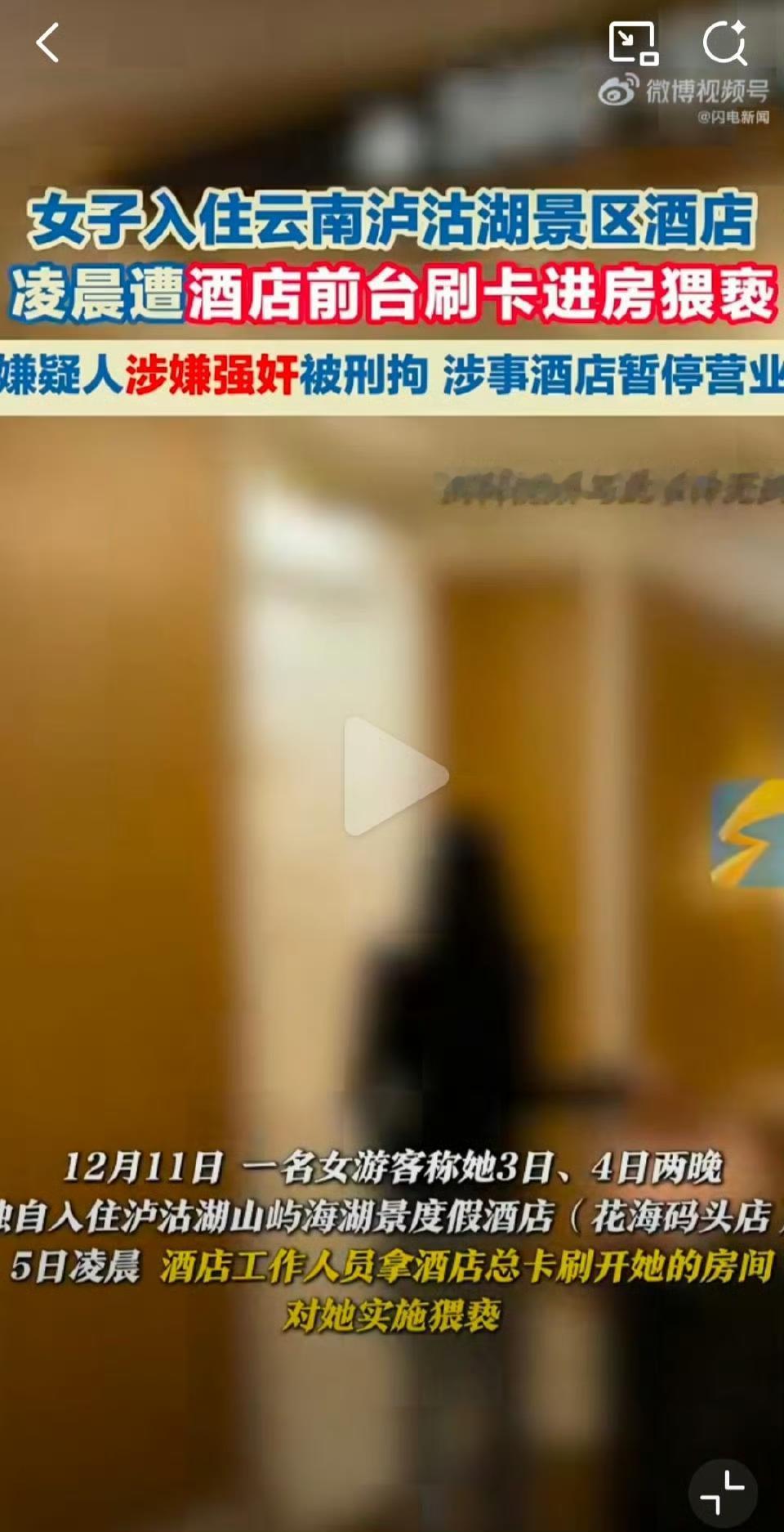 细思极恐!女子独自住酒店,凌晨遭前台刷总卡进房猥亵 云南丽江泸沽湖景区一起酒店安全事件引发全网愤怒!一名女游客独自入住泸沽湖山屿海湖景度假酒店,凌晨竟被酒店前台持总卡刷开房门猥亵,目前嫌疑人已被警方以涉嫌强奸刑事拘留,涉事酒店已暂停营业。 据游客爆料,她连续两晚独自入住该酒店,事发凌晨熟睡时,房门被前台工作人员用总卡打开。更让人寒心的是,事发后酒店仅发微信简单致歉,仍正常营业,直到舆论发酵才停业整改。 酒店方回应称,前台持有总卡是为方便帮客人解决问题,且强调过未经允许不得擅自进房,但涉案员工入职仅三个月,却利用职务便利实施侵害。律师明确表示,嫌疑人已构成强制猥亵罪,酒店因未尽到安全保障义务,需承担相应民事赔偿责任。 此事戳中了所有旅行者的痛点:付费入住本应换来隐私与安全,可失控的酒店总卡却成了“犯罪密钥”。网友纷纷吐槽“独自住酒店太没安全感”,并分享门阻器、桌椅抵门等自保方法,满是无奈。 酒店的安全底线不能只靠“口头强调”,总卡管理必须有刚性约束。你住酒店会做哪些安全防护?评论区聊聊你的经验~