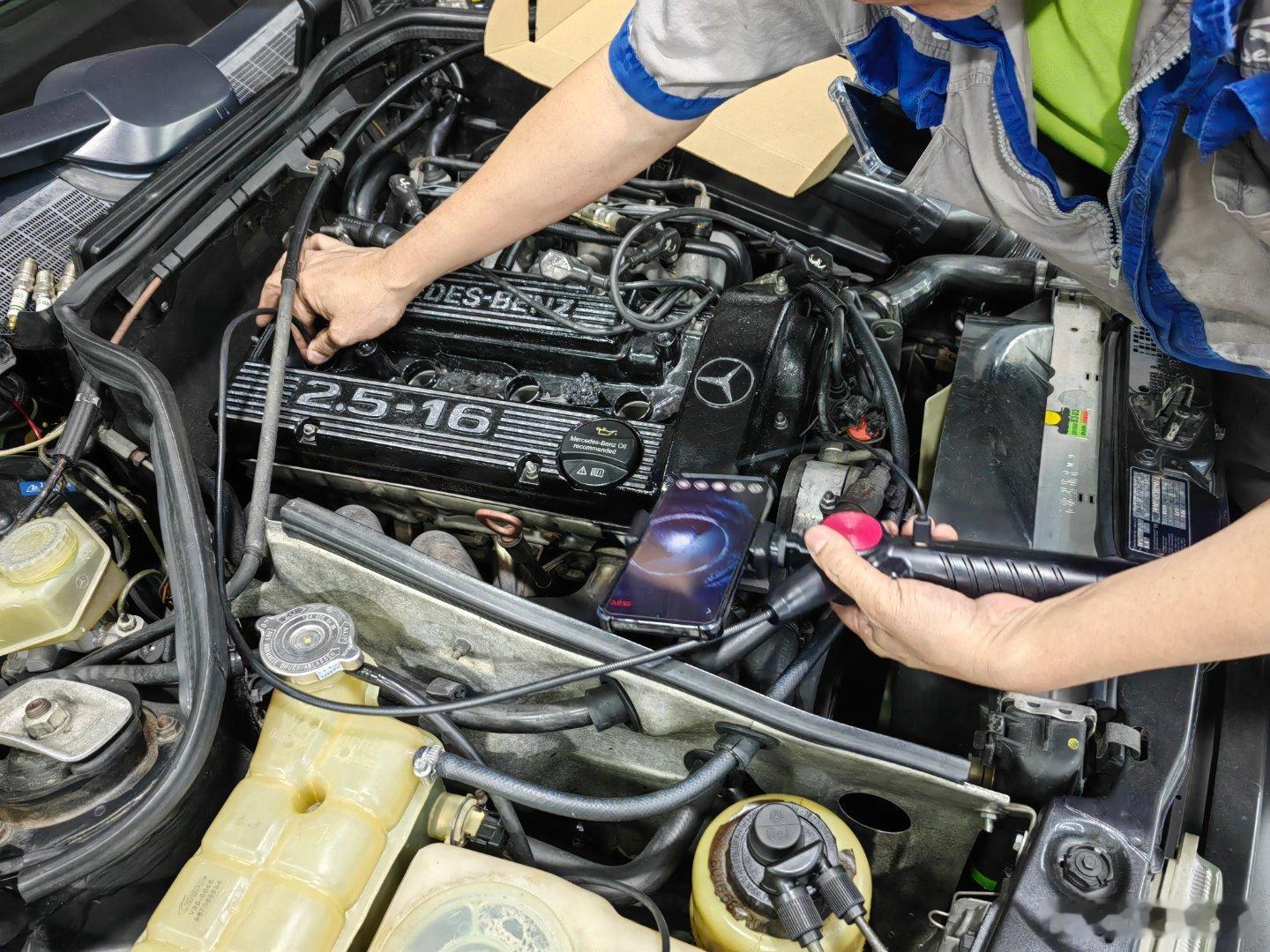 两部老奔驰聚首一堂,一部是大修完之后5000km的检查 (图2),我们除了检查火嘴,看看燃烧效果、空气燃油混合比的状态之外,还用内窥镜检查引擎燃烧室,然后把引擎再调到最好状态。另一部是大修刚完成,准备长途试车(图6)ANYCAR粤港汽车文化大v聊车老车玩家