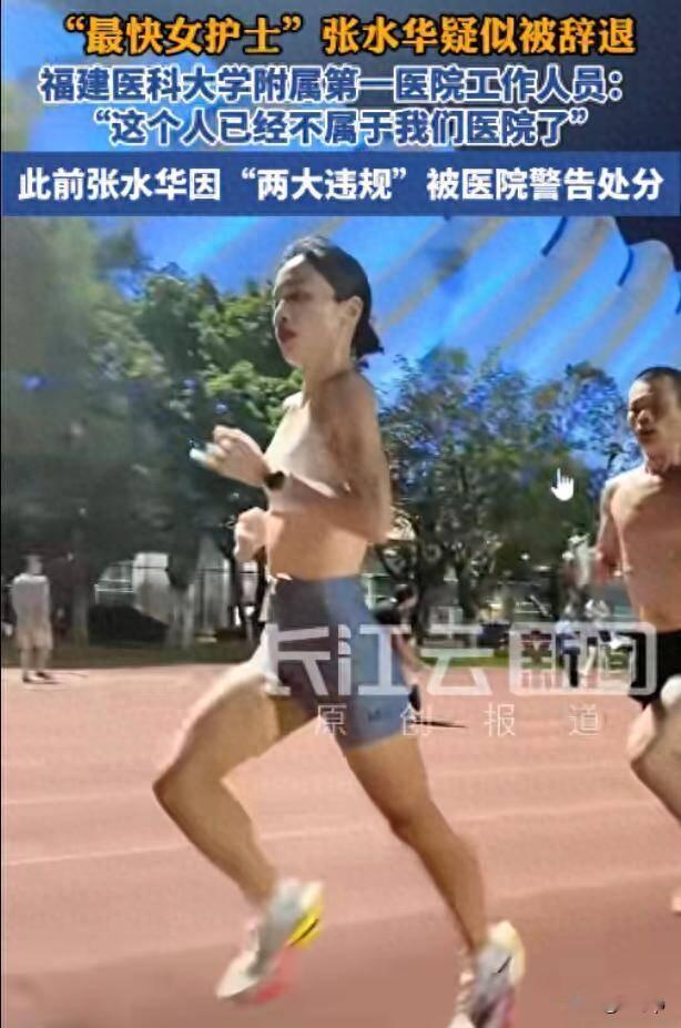 张水华疑似被医院给辞退了 一位医院的工作人员在接受电话采访时说:“她已经不属于我们医院了” 估计她也不会在意这个辞退不辞退的 这几年跑马拉松也得了不少奖金 还接了广告代言,比上班挣的还多 其实工作之余跑马拉松这事无可厚非 错就错在接受采访时说,希望她的领导支持她调休参加比赛,这就有点强加于人了,因为这是你自己的兴趣爱好 在不影响工作的情况下,都没问题, 关键是当时得了第一名,以为有底气跟上级谈条件,殊不知他根本不理会你这一套,毕竟名利都是你自己的
