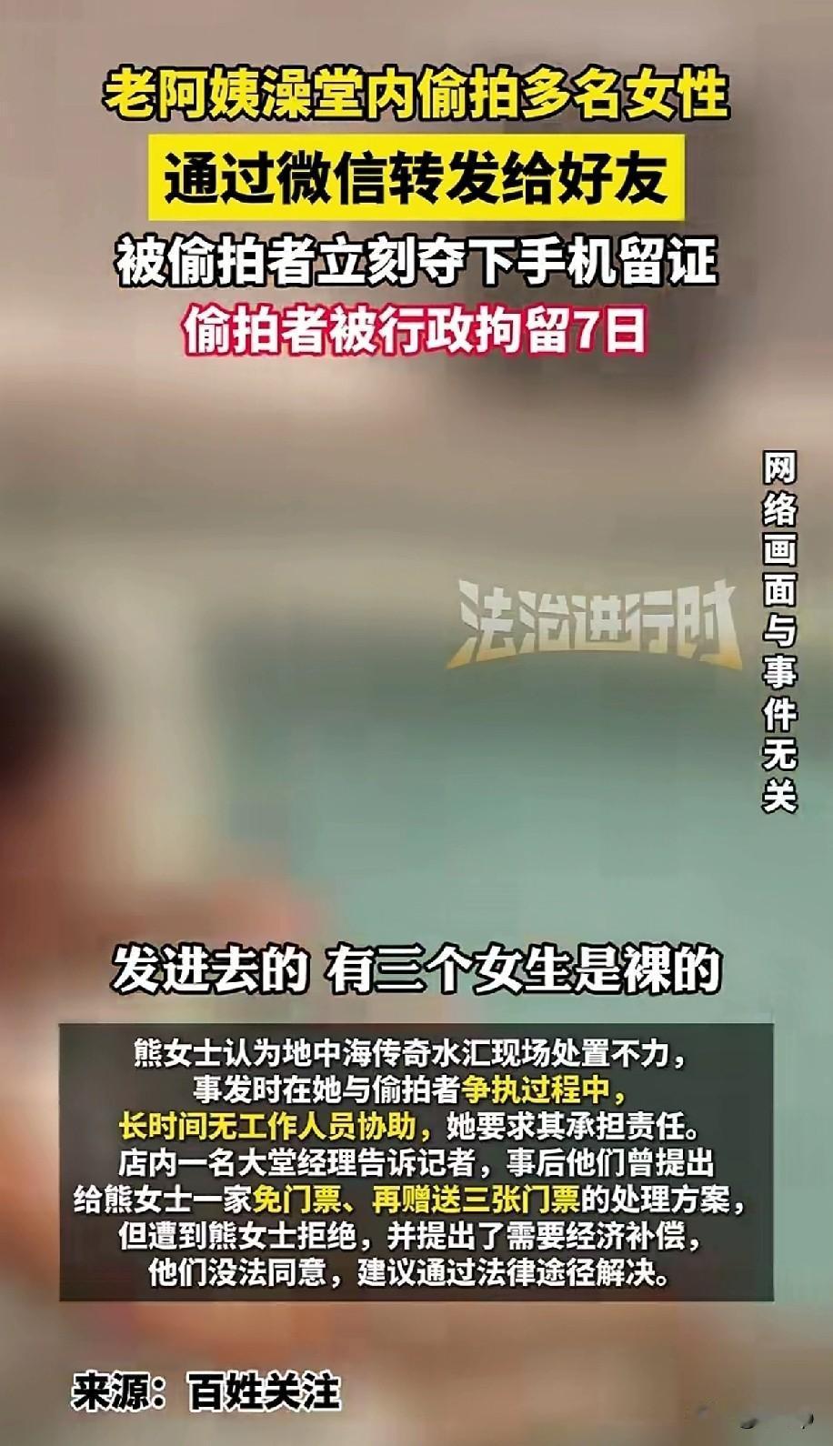 老阿姨在澡堂内偷拍多名女性 通过微信转发给好友 熊女士夺过她的手机作为证据 事发时澡堂的工作人员就在那看着 也没有人过来帮忙,熊女士非常气愤 大堂经理提出的解决方案是免除熊女士一家的门票,并再赠送三张门票,被熊女士给拒绝了 这老阿姨多半是受人指使的,看看聊天记录发给谁了,一目了然的事,澡堂的出来方式非常欠妥,换做是谁也接受不了,当时就应该积极的配合抓偷拍者才是正确的做法。