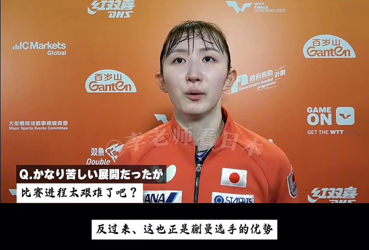 完败蒯曼—早田希娜含泪总结2025这一年 12月11日,香港总决赛女单1/8 决赛中,早田希娜0:4蒯曼, 止步首轮比赛,赛后早田含泪🥹 表示: “在亚锦赛上与蒯曼打过一次, 与那次相比, 球不一样,环境也不一样, 自己没有什么准备, 就投入到比赛, 自己对赛前准备不足, 比赛进程中,脑子跟不上, 始终被领先,非常困难, 自己也没有组织好技战术, 反而让蒯曼的技术越来越好的发挥, 今后对战左手球员, 还应该超越这个壁垒, 在混团世界杯的时候, 腿有点拉伤, 还有一点感冒, 但这并不是我输掉比赛的理由, 主要是技术问题, 这一年,我的积分排名 下降了很多, 奥运会后, 半年没有比赛, 为了继续前行, 在这么困难的情况下,坚持比赛, 坚韧负重这么长时间, 时间跨到2026年, 自己认为自己的坚韧是对的, 自己也会继续拼搏!” 不分国籍, 早田希娜道出了所有运动员的苦, 只有国乒运动员还在坚持✊, 不敢大胆表达, 致敬所有运动员!