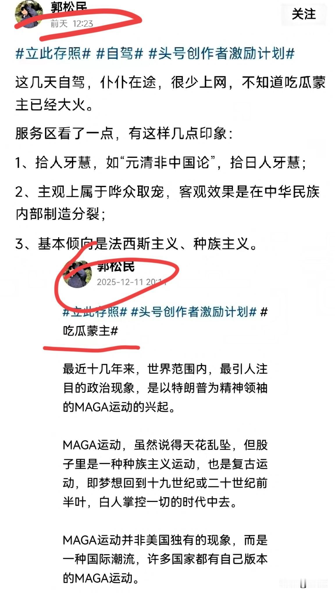 针对吃瓜盟主的批评如果说第一阶段的以大头Y,意大利炮为代表的主播已经偃旗息鼓失败而走的话, 如今第二阶段,一些看似立场端正的大V纷纷下场。张捷、项立刚之后,郭松民也来凑热闹。 可这些大V有个通病,都没看过盟主视频,仅凭别人给的二手信息就开炮,先树个靶子再射箭。就像郭松民,洋洋洒洒千余字,就说吃瓜盟主是中国版MAGA,却根本不分析两者差异。 在我看来,大V们如此盲目批评,既不严谨也不负责。吃瓜热议