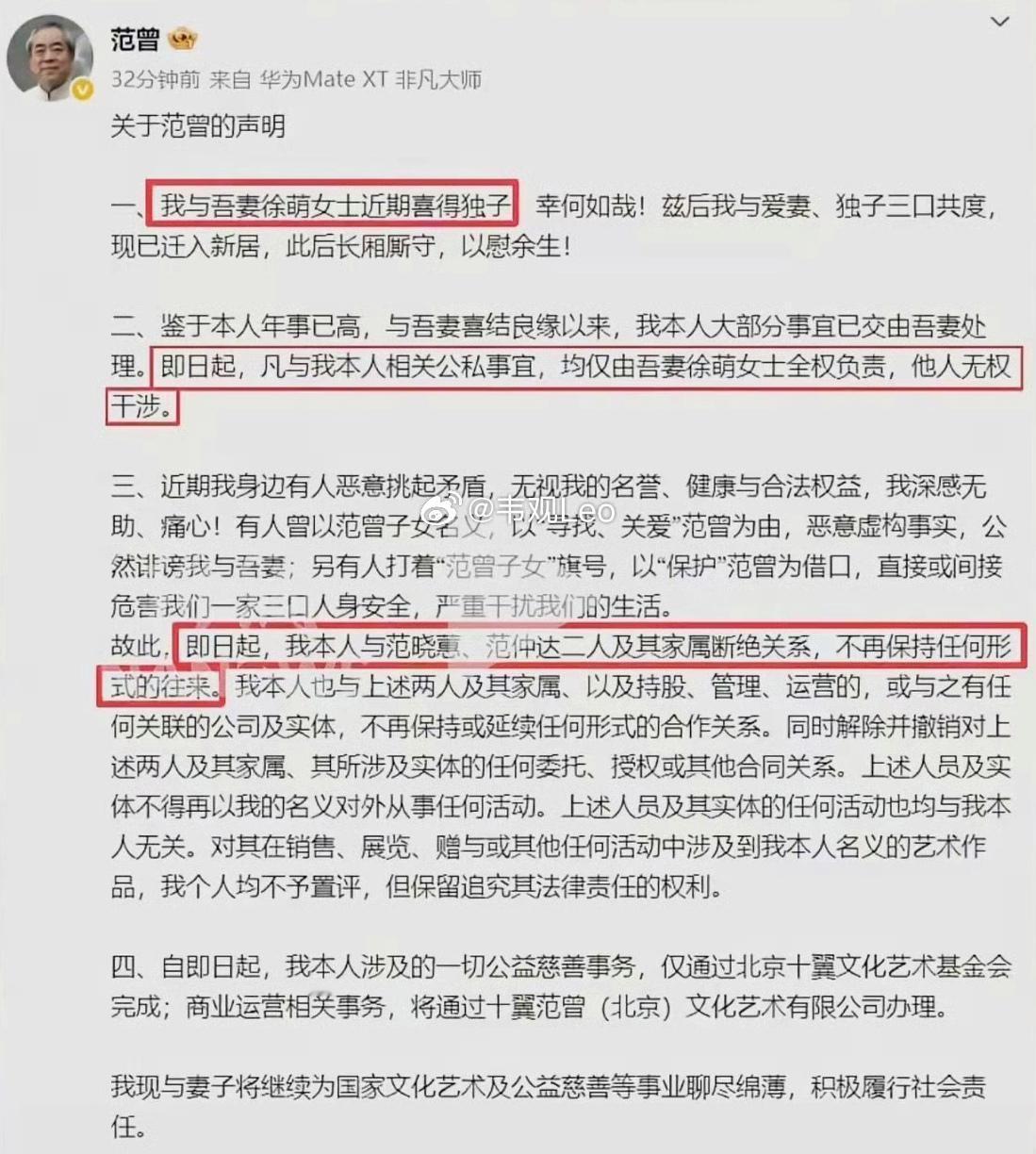 范曾,真的是一个狠人。 他的一生中,做的这三件事,起码已经打败了世上99.5%的人。 ①、垂垂老矣,娶了一位比他小50岁的娇妻,羡煞旁人,小娇妻颜值和身材都不输女明星。 ②、2025年,范曾都87岁了,这样的年纪,目前,他本人宣布了一件事,小娇妻已经为他诞下了一个儿子,这不仅是他本人的大喜事,也为广大男同胞们提了个醒,87岁也是可以让女人怀孕的。 ③、也是最狠的事情,他为了一家三口的安心生活,在宣布诞子的同时,也宣布和女儿、继子断绝关系,包括生活往来和工作。 不得不说,范曾真的太狠了,就算是和自己孩子有什么过节,作为一位父母,和孩子断绝关系,一般人是做不到的。 不管什么原因,范曾说了,自己年事已高,今后的所有个人和工作上的事情,都由妻子代办,他只管做自己喜欢的书画和慈善,他做的这几件事,每一件都让人惊讶,但同时也说明了一件事,任何能成功的大人物,做事风格都不平庸,毕竟常人是做不到的。