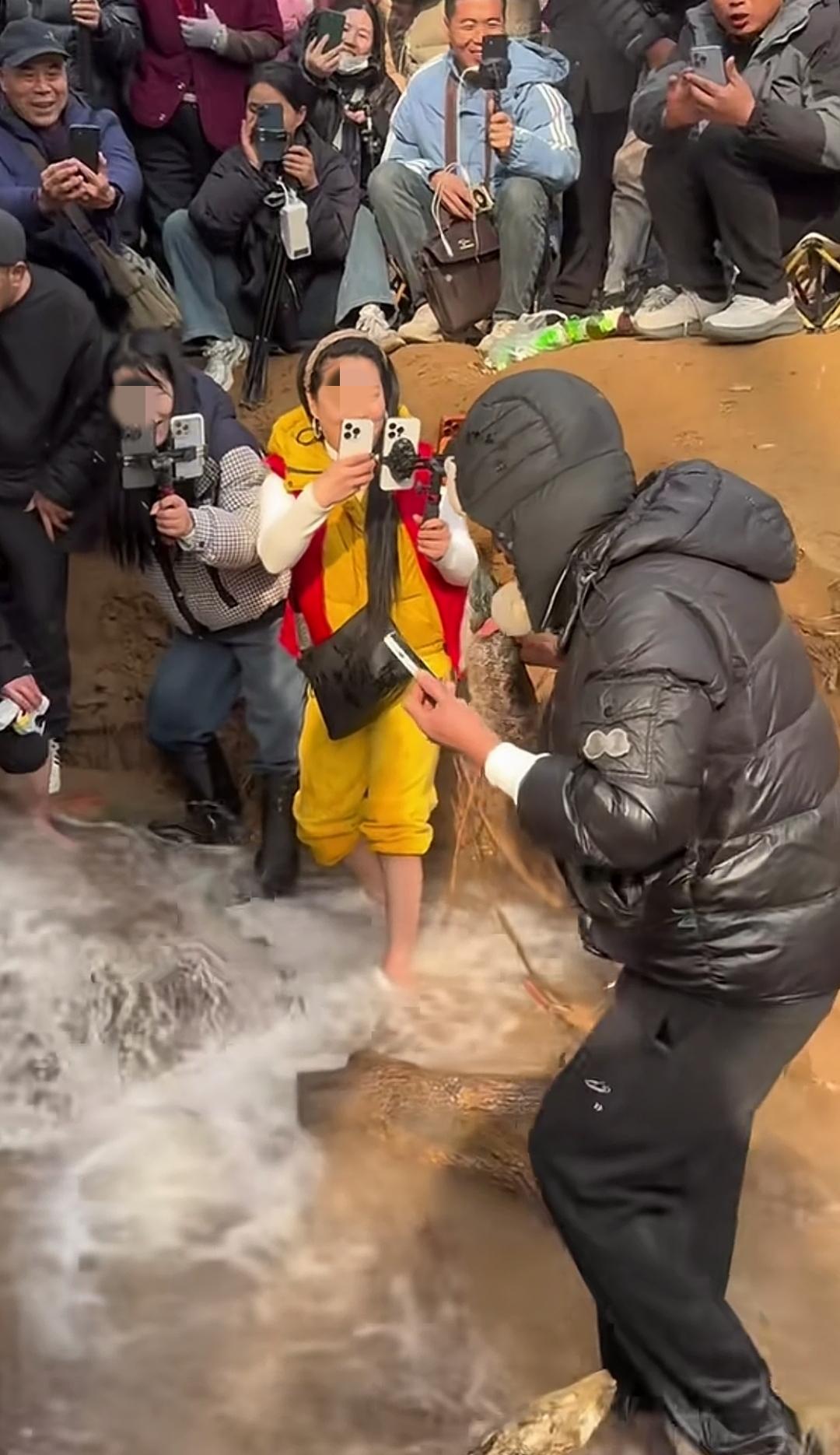 近日,郑州贾鲁河源头一处泉眼又开始冒水了,而且水还有温度,一些人可以赤脚站在水中,也不会感觉到冷。 围观的人全都是羽绒服,可见天气还是非常寒冷的。 一个主播,随手抓起一条鱼,以我多年钓鱼的经验来看,这应该是一条黑鱼,这个季节它应该冬眠,不知道为什么冒了出来,可能是被温水提前激醒了。 我觉得当地应该行动,别让直播乱象污染了这处泉眼。 人们对水源的美好向往,可以理解,但应该有秩序。