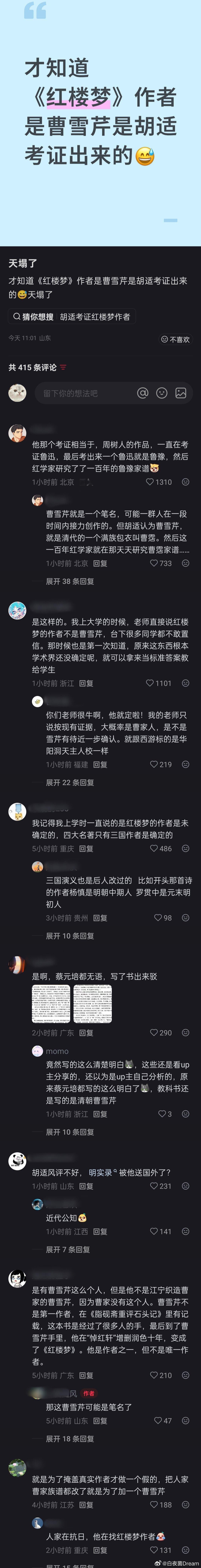 才知道红楼梦作者曹雪芹,是胡适考证出来的