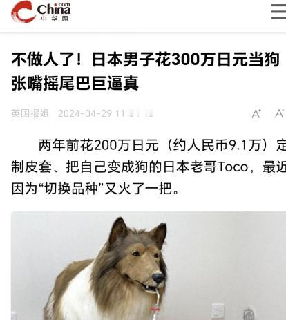 日本一男子为了成为一条狗,竟花了高达200万日元,不但买了一身的狗皮,处处模仿狗的动作。 这事在网上吵翻了,有人骂他不正常,放着好好的人不当偏要学狗爬;可他妻子却在采访里说,从没见他穿狗皮套时那么放松过,嘴角都带着笑。 这个叫toco的40岁日本男人,这两年把“当狗”这件事越做越认真,从一开始在家偷偷模仿,到后来穿着定制狗皮去公园遛弯,最近更是砸了300万日元升级装备,尾巴能灵活摇摆,嘴还能张合喘气,远远看去跟真狗没两样。 2022年那会儿,toco第一次花200万日元找道具厂做狗皮套。 那身皮套用了透气材料,耳朵里藏着小电机,能跟着声音动一动。 他每天下班回家就穿上,在地板上爬来爬去,用嘴叼拖鞋,连吃饭都想趴在地上。 刚开始拍视频发网上,看的人没几个,评论区全是“浪费钱”“脑子坏了”的话。 可他没停,反而越玩越投入,2023年夏天干脆跑到东京杉并区的公园去“社交”,结果被真狗当成怪物,吉娃娃吓得夹着尾巴跑,金毛对着他汪汪叫,场面又尴尬又好笑。 去年4月,toco的新装备让全网陷入争议。 300万日元的阿拉斯加犬皮套,光是尾巴就装了液压杆,能甩20厘米远,嘴部装了联动装置,喘气、吠叫的样子像极了真狗。 他穿着这身行头在涩谷公园追飞盘,被“主人”摸头时还会撒娇蹭腿,视频三天就破了500万播放。 有人说这是现实版《动物狂想曲》,甚至有宠物食品品牌找上门想合作,没想到“当狗”还真当出了点名气。 最让人意外的是他妻子的态度。 记者问她就不觉得奇怪吗?她笑着说:“他上班时总说自己像个机器,可穿上狗皮套就会笑出声。 只要他不伤害自己,我为什么要拦着?”某社会学家后来分析,这几年日本支持家人“奇怪爱好”的比例涨了不少,说到底是大家活得太累,家里能少点冲突就少点,不惹麻烦成了相处底线。 toco的事,其实是很多日本家庭的缩影,与其互相指责,不如睁只眼闭只眼。 网上的骂声一直没停。 保守派媒体说这是践踏人的尊严,街头采访里六成中老年人摇头说“看不懂”。 但也有心理学教授出来说话,说toco这叫“角色退行”,通过模仿动物释放压力,比酗酒、暴饮暴食安全多了。 确实,日本这几年“拟兽爱好者”越来越多,有个协会会员都过万了,不少上班族周末就穿上猫、狼的皮套聚会,说白了都是被压力逼的,想找个地方喘口气。 从200万日元的初代狗皮到能摇尾巴的阿拉斯加装备,toco用最极端的方式戳中了很多人的痛处。 他不是真的想当狗,只是想找个不用伪装、不用“活得像机器”的时刻。 我们或许永远不会理解这种选择,但看着他穿着狗皮套在公园追飞盘时的样子,突然明白:这个时代,能让一个人真正放松的方式,已经越来越少了。