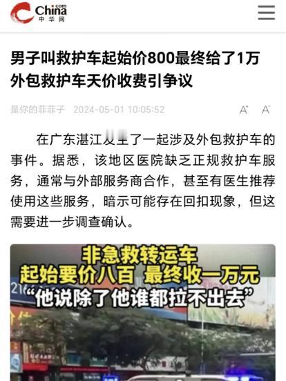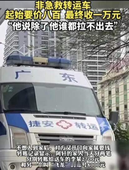 令人愤怒,救护车居然变成了“人肉馒头”! 家属谈好800元的救护车转运费,车还没发动就被坐地起价到8000元,快到目的地时司机又伸手要2700元。 广东湛江这事儿听着就让人冒火,病危老人躺在车上,家属除了掏钱还能怎么办? 阿轩当时急着带家人返乡,医院说没有非急救转运车,只能找外包公司。 电话里讲好800块跑一趟,老板到现场就变卦,指着急救设备说“这些不要钱?”硬是把价格抬了十倍。 家属含泪刷了8000块,结果快到家时司机又说“老板给的钱不够我的辛苦费”,不交钱就不开车门。 这种事儿真不是第一次发生。 去年郑州有患者转院,1500元的路程被加到5000元,司机说“跨省就得加过路费补贴”;南京那起更离谱,说好3000元的临终转运,因为用了呼吸机直接涨到8800元。 这些公司都摸准了家属的软肋,谁会拿病人的命讨价还价? 为什么他们敢这么嚣张?查了下才发现,42%的非急救转运公司都没做价格备案,38%在超范围经营。 就像湛江这家公司,有运输许可证却从不公示收费标准。 更气人的是有些医院,把业务独家包给一家公司,患者根本没得选。 老板那句“除了我谁都拉不出去”,说的就是这种垄断底气。 现在北京上海早就出台了参考价,2块钱一公里加200块起步费,明码标价。 深圳今年搞了个转运服务平台,12家公司在线比价,投诉率直接降了一半。 我觉得关键还是得让信息透明,让患者能选、敢说不,那些想趁机发横财的公司才不敢这么猖狂。 从800元到10700元,涨的不只是数字,更是对生命尊严的践踏。 当救护车司机开始算计“辛苦费”,当救命通道变成摇钱树,我们最该做的就是把那些藏在暗处的加价规则晒在太阳底下。 毕竟谁也不想有一天躺在车上时,家人还得为天价账单发愁。
