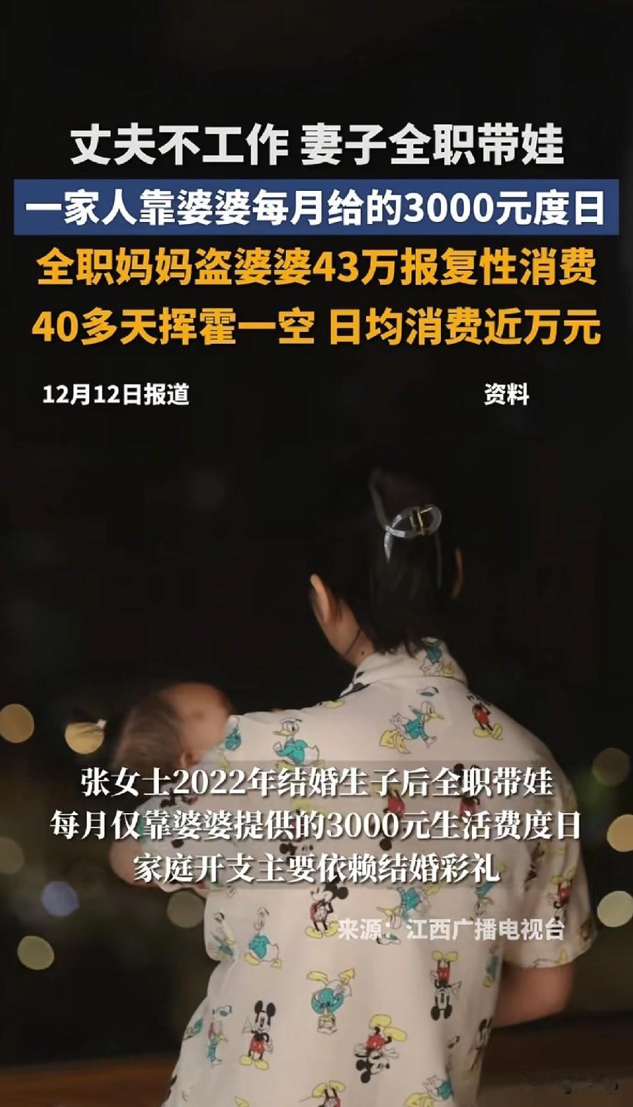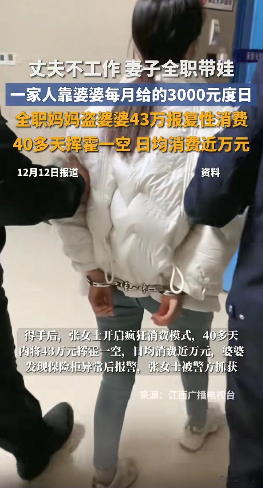 00后全职宝妈偷走婆婆43万 40天内在KTV挥霍一空 只因丈夫整天不工作,婆婆也不帮忙带娃,但婆婆每月给她3千的生活费 丈夫的不作为加上婆婆的不帮忙,让她心生怨恨,多次提出离婚,最后都是由家人劝和,但她心里还是不平衡,今年3月份手里的积蓄也快没有了,她就盯上了婆婆屋里的保险柜,她以钥匙丢失为理由联系开锁公司,第一次拿走2.53万元,两天后又拿了7万多,喊来闺蜜们一起去KTV消费,还带孩子去旅游,就这样前后把这43万花完了,后来婆婆才发现钱没了,报警后很快小张就被抓了,后来在丈夫和亲戚的劝说下,婆婆才出具了谅解书,最后法院判处小张有期徒刑三年缓期四年,并赔偿损失。 虽然这位宝妈做错了,但她的丈夫和婆婆都有一定的责任,但凡当时他们其中有一个能帮忙缓解一下带孩子的辛苦,她也不至于走到这一步吧