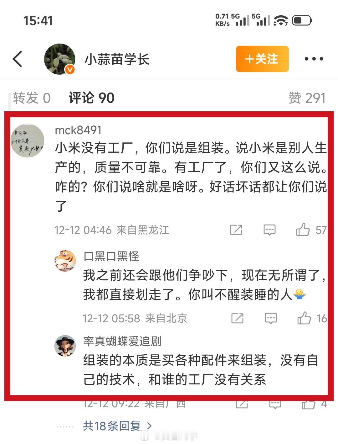 挺久没有刷到小蒜苗了,刚主页给我推了一条“本质上,自产并不代表什么,苹果就全是代工的,有问题么?”正话反话都被他们这些人说完了“小米没有工厂,你们说是组装。说小米是别人生产的,质量不可靠。有工厂了,你们又这么说。咋的?你们说啥就是啥呀。好话坏话都让你们说了”看了一下评论区,还行!群众里面还是有明白人的当时雷总干小米汽车的 V8s,就是预料到了你们会这么说,然后索性直接全流程自己干