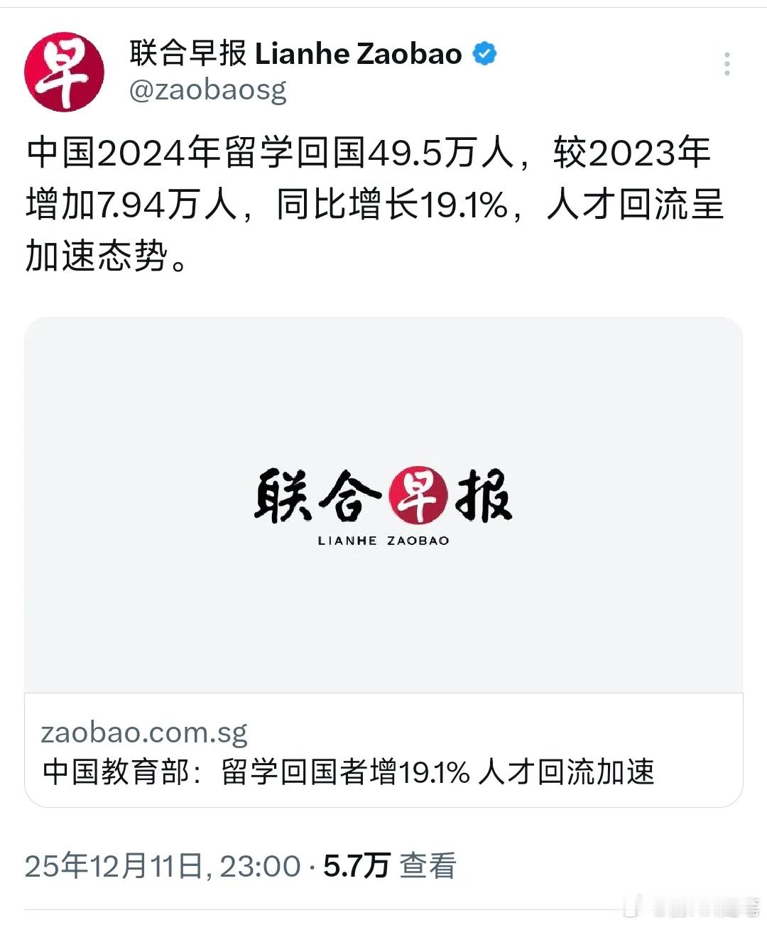新加坡联合早报12月11日晚报道:“中国2024年留学回国49.5万人,较2023年增加7.94万人,同比增长19.1%,人才回流呈加速态势。”现在中国很多家庭支付得其留学费用,加上国外上大学容易多了。特别中国学生只要通过语言关,学习能力很强。