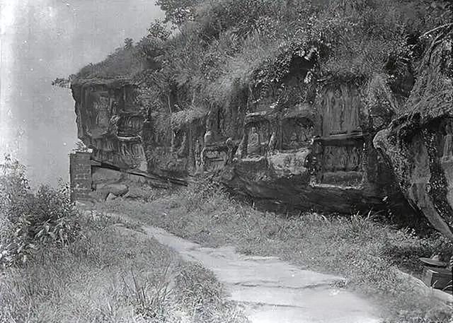 1914年6月21,四川夹江千佛岩,崖壁嵌在荒草蔓生的山野间,粗糙的岩石表面被凿出一排排佛龛,龛里的造像隐约能看出身形轮廓,却已被岁月磨得模糊——没有后世修缮的鲜亮,只剩石质本身的沉暗与斑驳。 崖脚是一条简陋的土路,路面坑洼、覆着杂草,像是当时行人往来的寻常便道;崖顶的荒草肆意疯长,几乎要掩住佛龛的边缘,连旁边矮矮的砖石小墙,混着一种未经修饰的荒寂感,这不是如今游人如织的“景区”,只是百年前藏在川中山野里、与自然共生的古刻遗迹。
