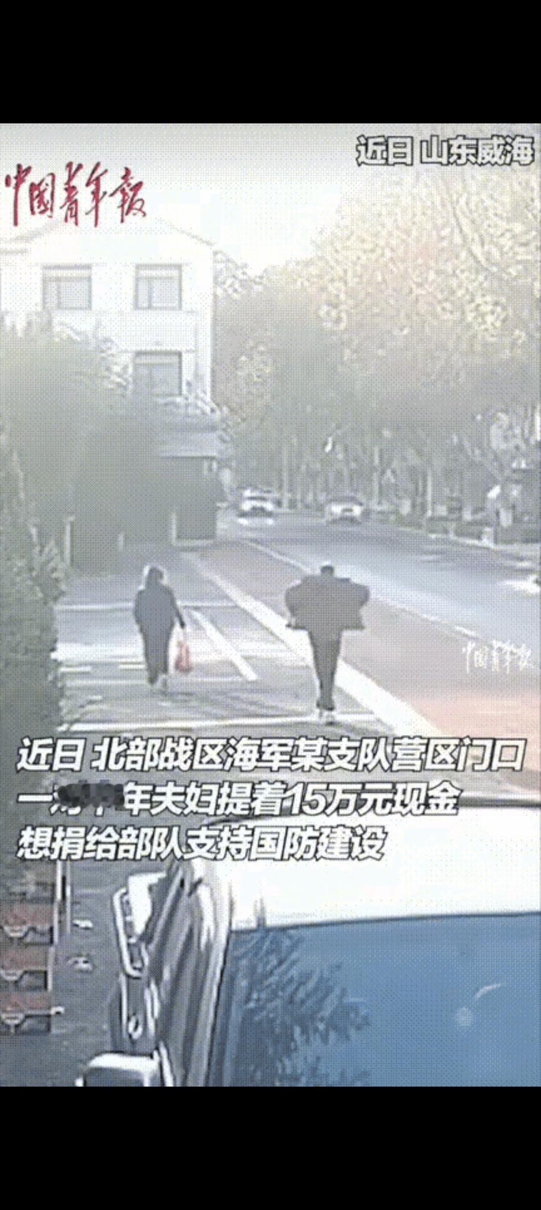格局太大了!山东威海,夫妻俩拿着个手提袋送到了北部战区海军支队营区门口,士兵还以为他俩要寻求帮助呢,万万没想竟然是捐给部队15万元现金用于支持国防建设! 士兵连忙拒绝,但是俩人放下手提兜直接就走了,离开时俩口子大步向前,走出了一身的骄傲! 男子边走边笑,洁白的牙齿是俩人赤城之心最好的证明! 对于国防建设来说可能15万元只是凤毛麟角,但是夫妻俩这种做法的效果堪比15个亿! 网友评论: 国家开账户,我们来捐钱!国家强大,人民才能安康!为这夫妻俩点赞! 真打仗15万一点用没有!但是却诠释了一个中国人对国防建设的支持! 15万对国家来说是小钱,但对靠自己辛苦劳作的老百姓来说是笔大钱了。为他俩点赞! 夫妻俩看起来也不是特别有钱的人,能做出来这种大义之举,我真心的敬佩,祝好人一生平安! 这种兵爱民,民拥军的人民部队是战无不胜,攻无不克的。