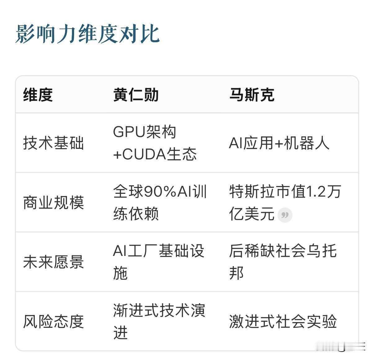 黄仁勋缔造算力帝国,马斯克AI应用的激进实验者。 《时代》周刊的终极答案, 2025年《时代》周刊给出了最具分量的评判——将年度人物授予"AI缔造者"群体,黄仁勋与马斯克并肩入选。 杂志特别指出:"他们掌握着历史的转轮,开发的技术正在重塑资讯结构、气候治理和人类生活方式。" 有趣的是,两人在财富上的巨大反差揭示了影响力的不同维度:马斯克以4914亿美元身家成为全球首富, 而黄仁勋仅以1633亿美元排第八——但英伟达3%的持股比例却控制着全球AI算力的命脉。 这恰如《时代》评价的隐喻:一个用资本丈量影响力,一个用技术定义未来。