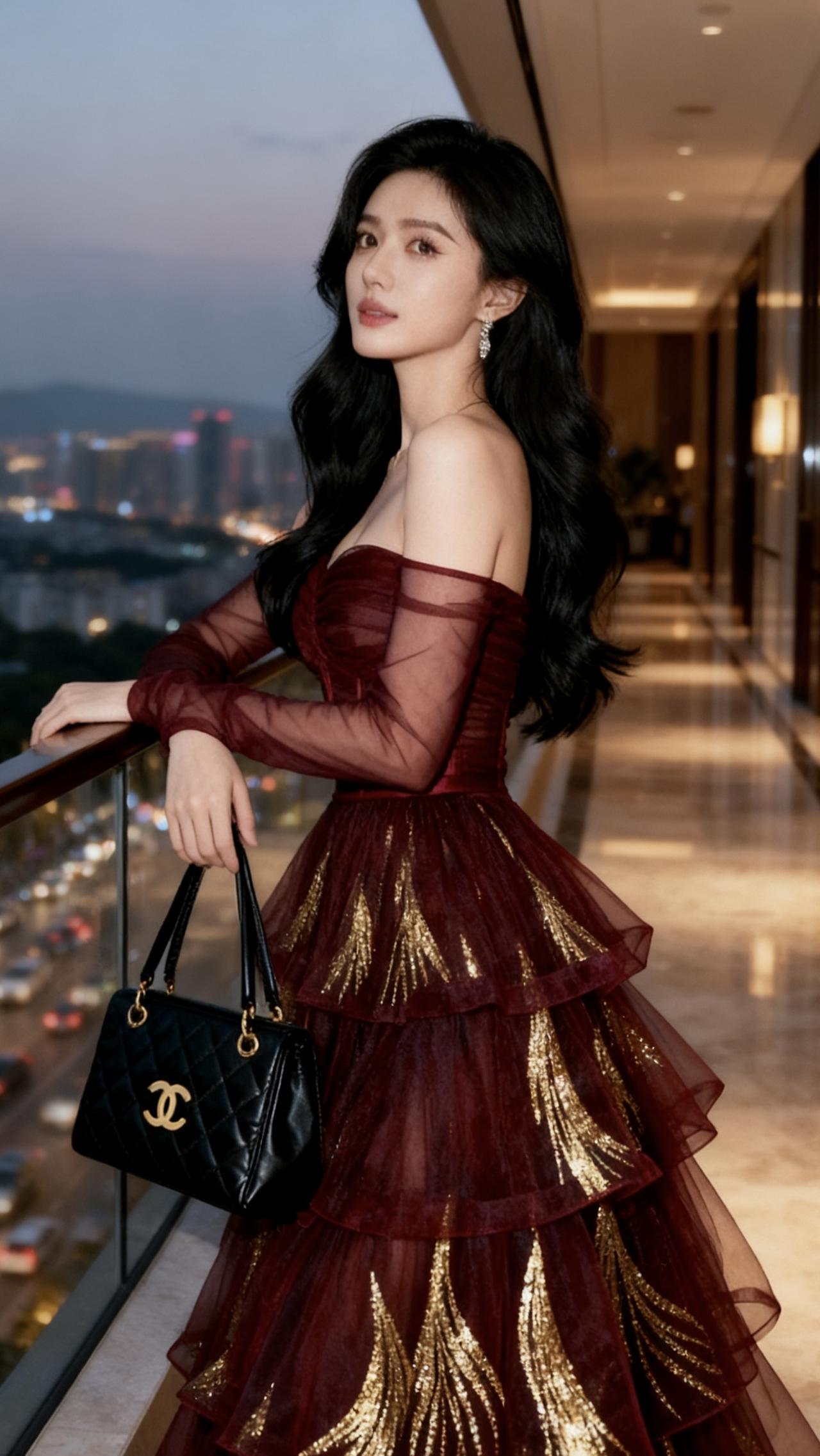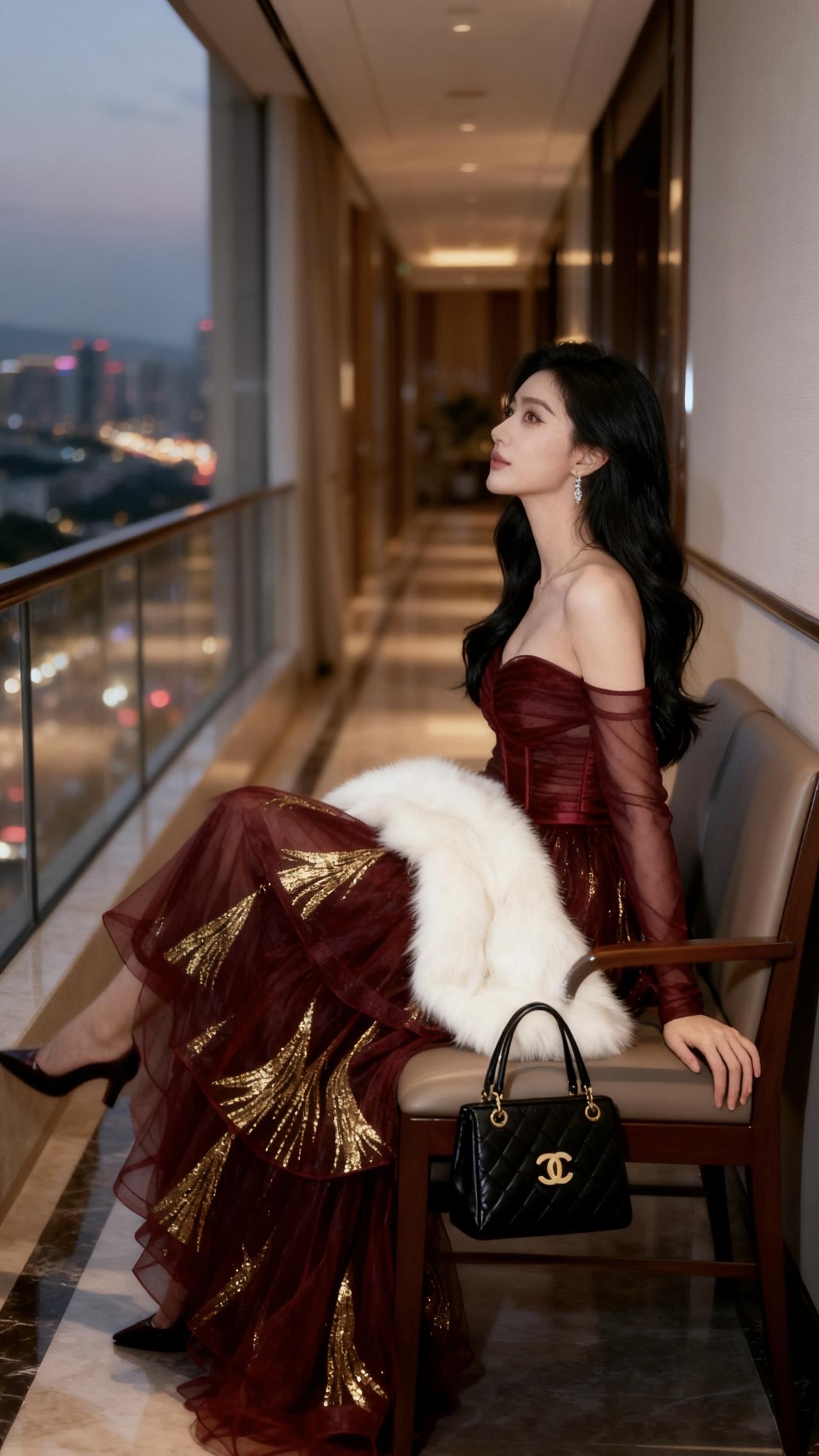 气质穿搭怎么穿才恰到好处?都市夜景下的优雅红裙,闪耀的金色裙摆,手捧香奈儿包包,尽显奢华与魅力。红裙穿搭美学
