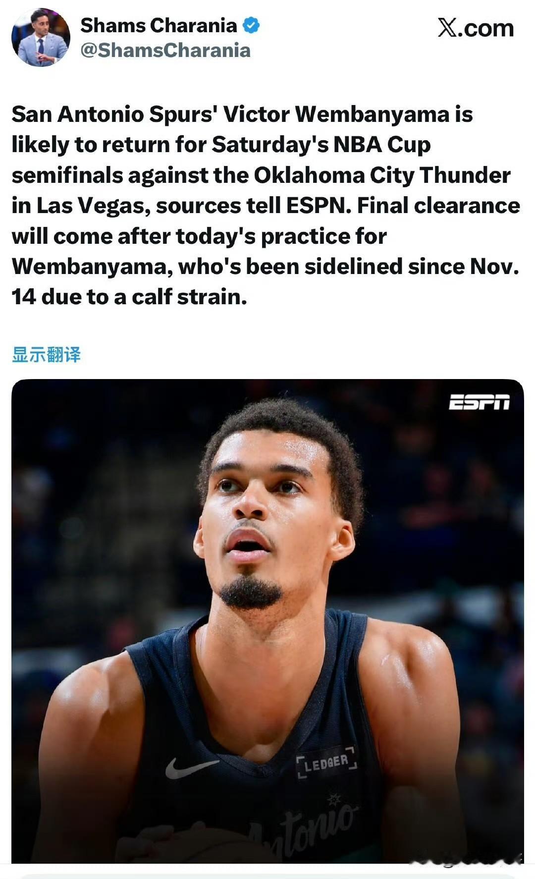 今天训练后出结果!!!文班亚马或在和雷霆的半决赛中复出! 周三和周四的半决赛晋级战结束以后,目前已经确定四支球队将于本周日(12月14日)上演半决赛对决,决胜出东西部的最终晋级名单。 根据记者Shams最新消息透露,马刺队当家球星文班亚马有可能会在对阵雷霆的杯赛半决赛中上演复出。 不过目前情况还没有最终确定,文班亚马自小腿拉伤以后缺席截止到明天正好算是一个月了,就看他明天能否出战还是会继续缺阵,这将根据今天的训练结果对外正式公布。 雷霆的实力已经基本上是板上钉钉的事情,当然一切都有可能,马刺也许会有机会淘汰雷霆,那就是看雷霆这些球员的发挥了,谁还没有个状态差的时候呢! 就看马刺队评估了,是上文班搏一次还是为了他的健康继续稳妥治疗,我们祝文班亚马早日康复! 给2026的自己写句话马刺 文班亚马