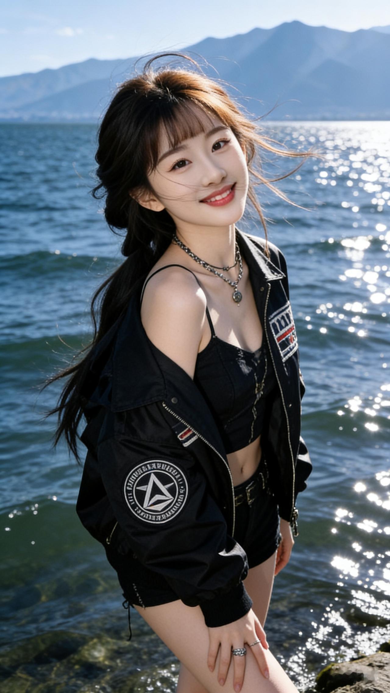 娇小少女立洱海畔,冷白皮似陶瓷般细腻水润,尖下巴衬均衡五官,娇羞浅笑。发丝风拂微乱,小众外套搭简约内搭,配饰精致。侧光勾勒立体轮廓,波光映苍山,随性感与美感交融,尽显青春澄澈。