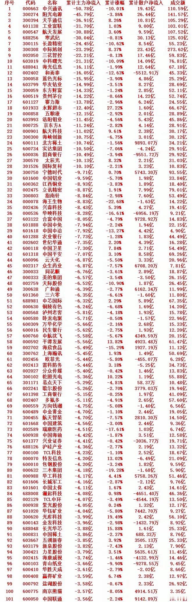 本周,主力趁高位,大幅卖出的个股名单(前100)1 000663 中兴通讯 -50.78亿 -10.01% 19.43亿 110.59亿2 300274 阳光电源 -45.79亿 -3.86% 26.44亿 141.57亿3 300394 天孚通信 -36.91亿 8.26% 10.81亿 105.29亿4 601138 工业富联 -31.70亿 1.03% 9.00亿 103.01亿5 000547 航天发展 -30.88亿 3.60% 9.59亿 107.52亿6 688256 寒武纪 -30.04亿 -0.81% 30.13亿 125.03亿7 300115 长盈精密 -24.45亿 -10.62% 8.54亿 55.23亿8 300308 中际旭创 -23.29亿 8.37% 23.43亿 273.62亿9 002050 三花智控 -22.21亿 -0.13% 17.46亿 59.83亿10 603019 中科曙光 -21.31亿 -10.09% 14.09亿 76.81亿11 688041 海光信息 -16.11亿 -1.99% 12.64亿 67.18亿12 002402 和而泰 -16.05亿 -12.63% -5512.91万 45.33亿13 300058 蓝色光标 -15.95亿 -3.90% 4.86亿 25.29亿14 603799 华友钴业 -14.99亿 -3.51% 8.27亿 28.69亿15 300059 东方财富 -14.33亿 -1.24% 2.85亿 52.11亿主力流出成普遍趋势:101 只股票的累计主力净流入全为负值,中兴通讯(-50.78 亿)、阳光电源(-45.79 亿)等头部标的流出规模突出,反映主力对这类个股短期态度偏谨慎。涨跌与资金流向存在背离:部分个股主力大幅流出但股价仍上涨,比如永辉超市(主力流出 - 12.40 亿,涨幅 27.22%)、光库科技(主力流出 - 3.99 亿,涨幅 19.49%),大概率是散户资金集中流入或其他资金承接所致。散户资金承接分化:多数个股散户净流入为正(如寒武纪散户流入 30.13 亿),但和而泰、实达集团等个股散户同步流出,这类标的可能面临资金双重撤离压力。成交额与资金流出同步:中际旭创(成交额 273.62 亿)、阳光电源(141.57 亿)等交易活跃的标的,主力流出规模也较高,体现出高换手背后的资金撤离动作。