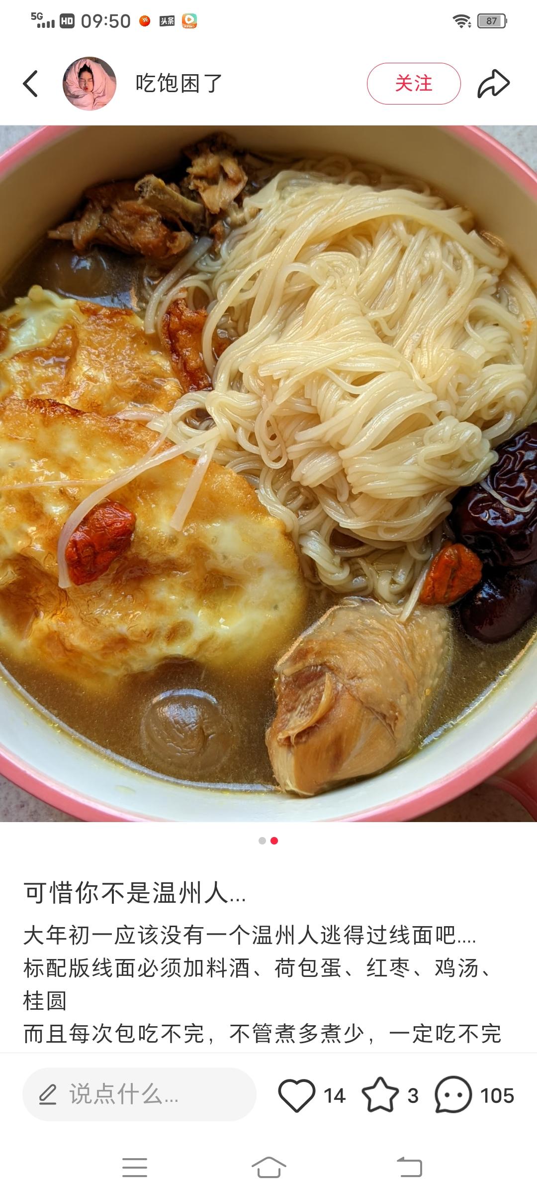 浙江11个地市大年初一早上吃的都是什么? 1、图一,湖州。吃的是很大很大的汤圆,本地人叫圆子。一般早上是吃两个,一个肉馅的,一个芝麻馅或者豆沙馅的,寓意团团圆圆。 2、图二,绍兴。吃的是细圆子+年糕,是甜口的那种。寓意甜甜美美。 3、图三,宁波。吃的是红豆年糕汤圆,也是甜口的。 4、图四,台州。吃的是五味粥,由大米、红枣、豆腐、芋艿、红薯组成,寓意好运满满。 5、图5,温州,吃的是甜线面,里面加有红枣、鸡汤、桂圆等。 …… 至于网上传的“浙江大年初一也有人吃饺子”这一说法,我想大概率是“新浙江人”,是这些年到浙江工作、生活的北方人,才有可能大年初一吃饺子。而土生土长的浙江人90%是不吃饺子的! 浙江的网友们,你们大年初一早上吃的是什么?