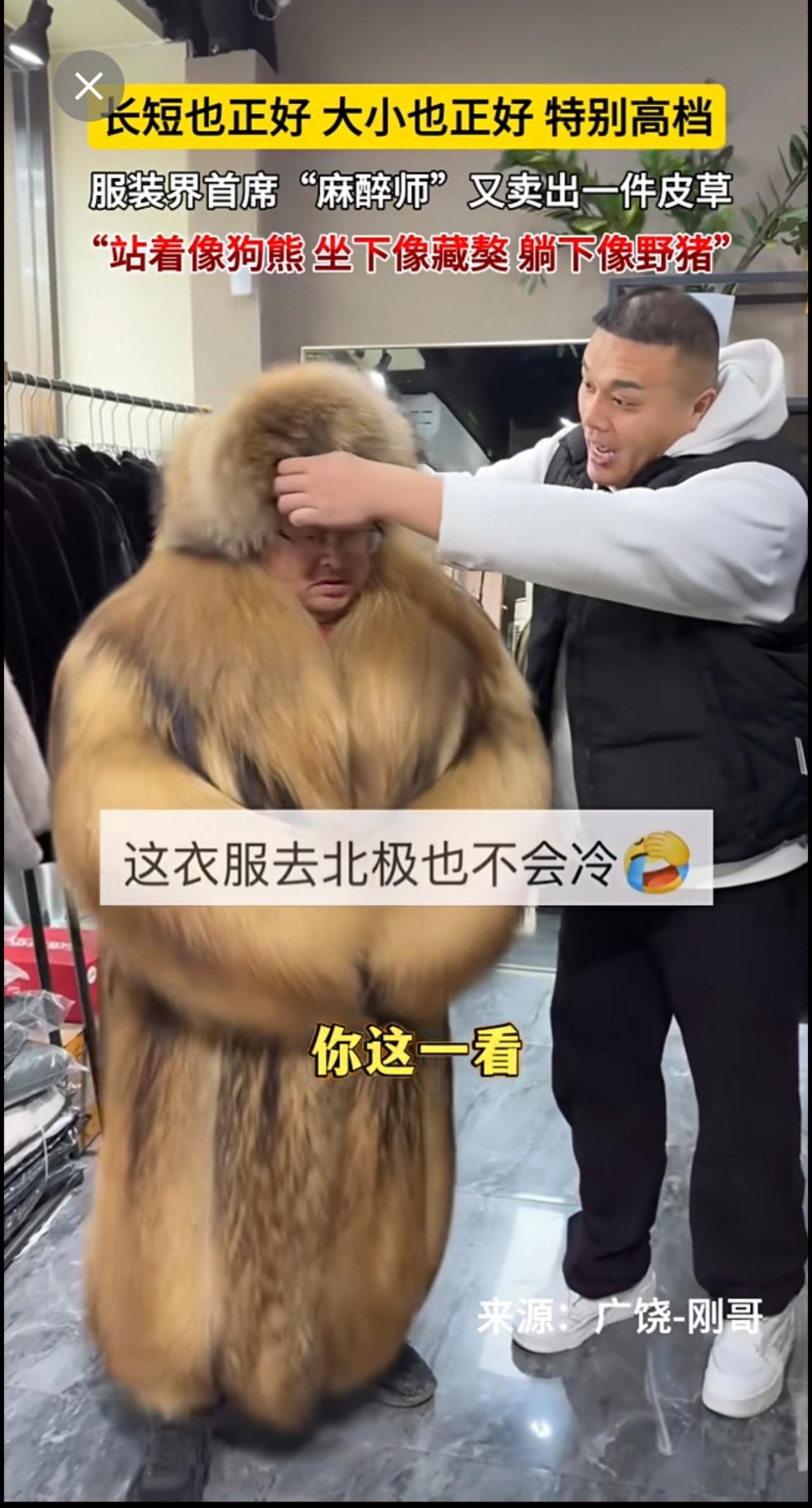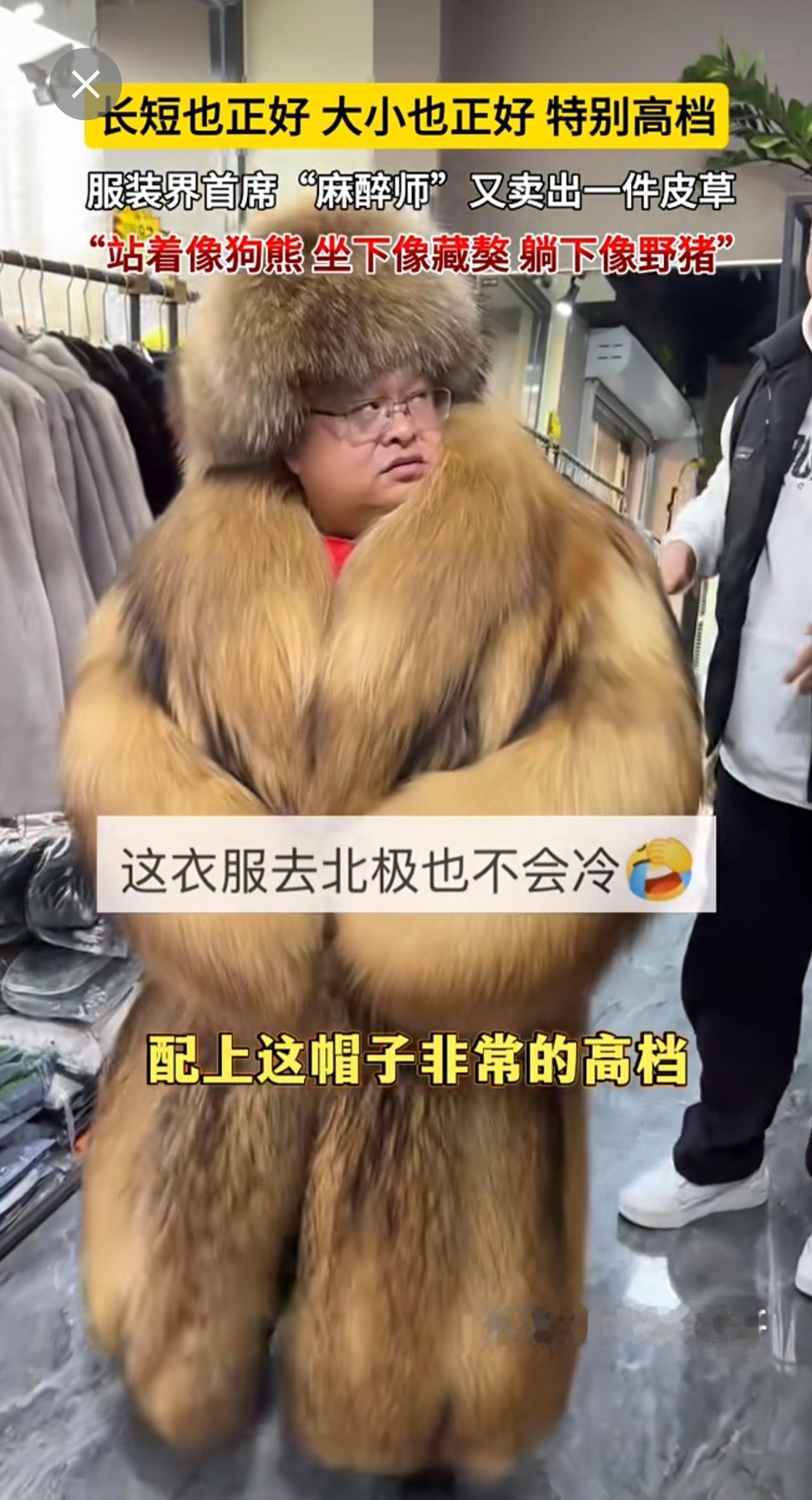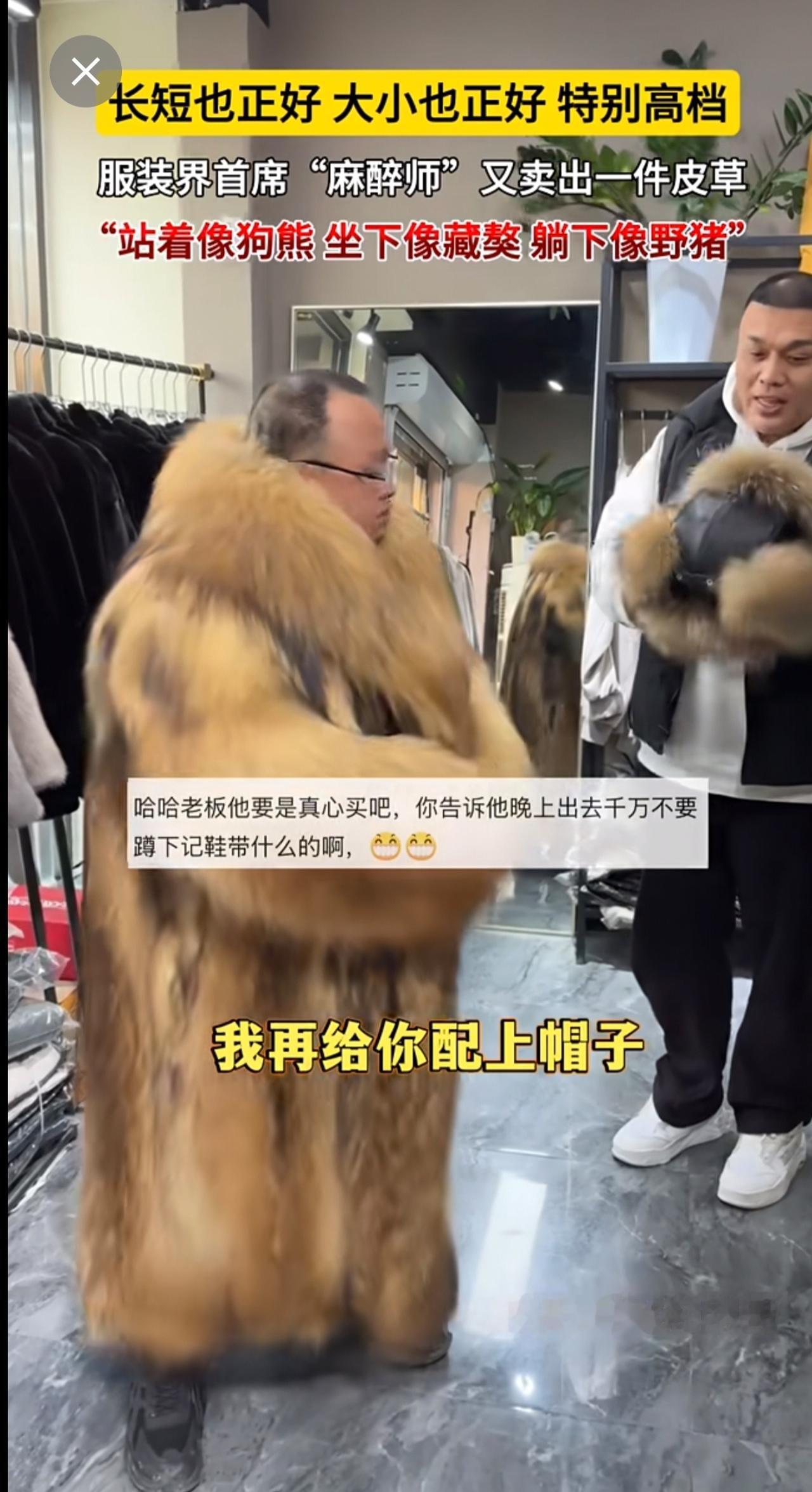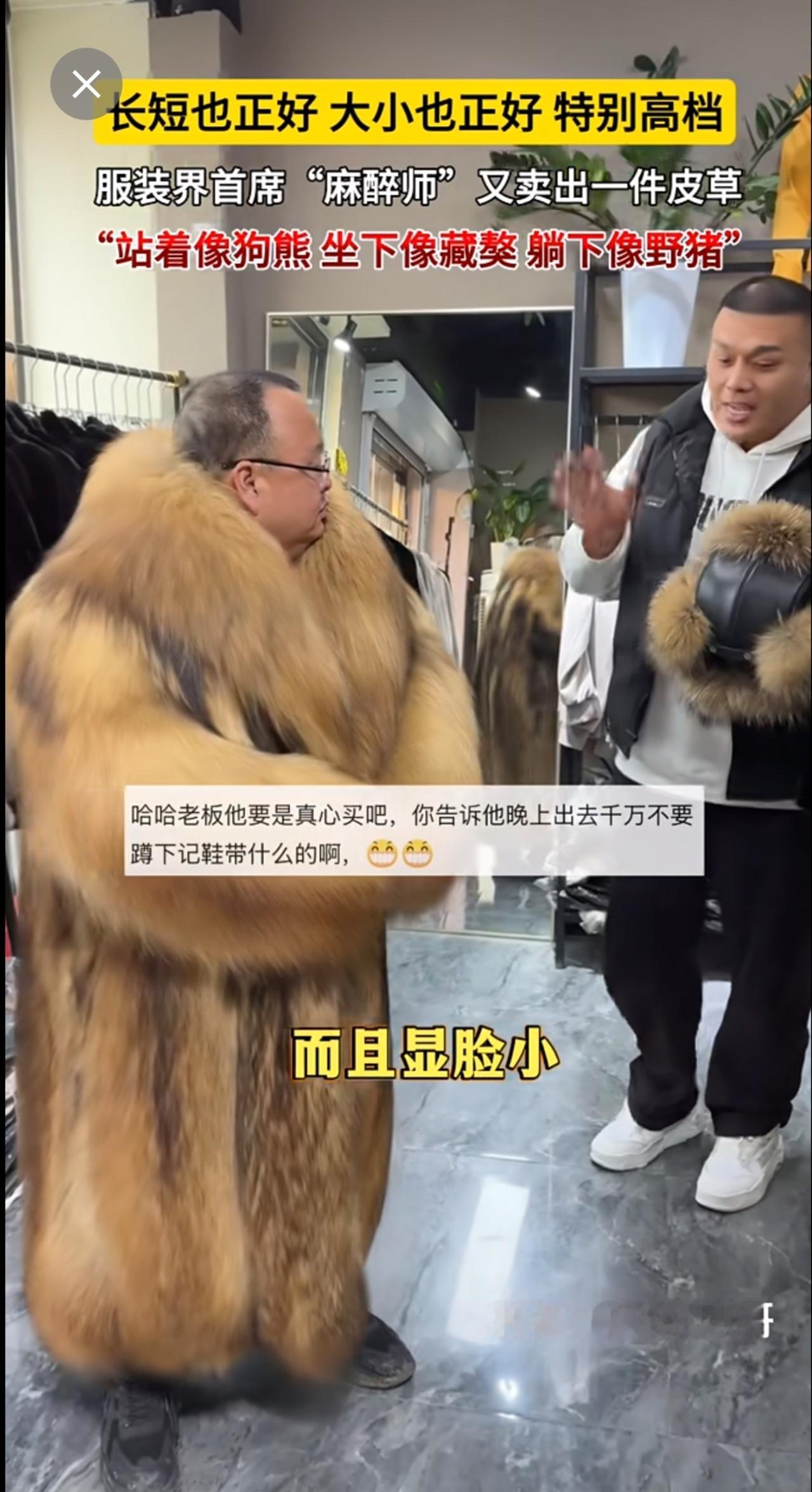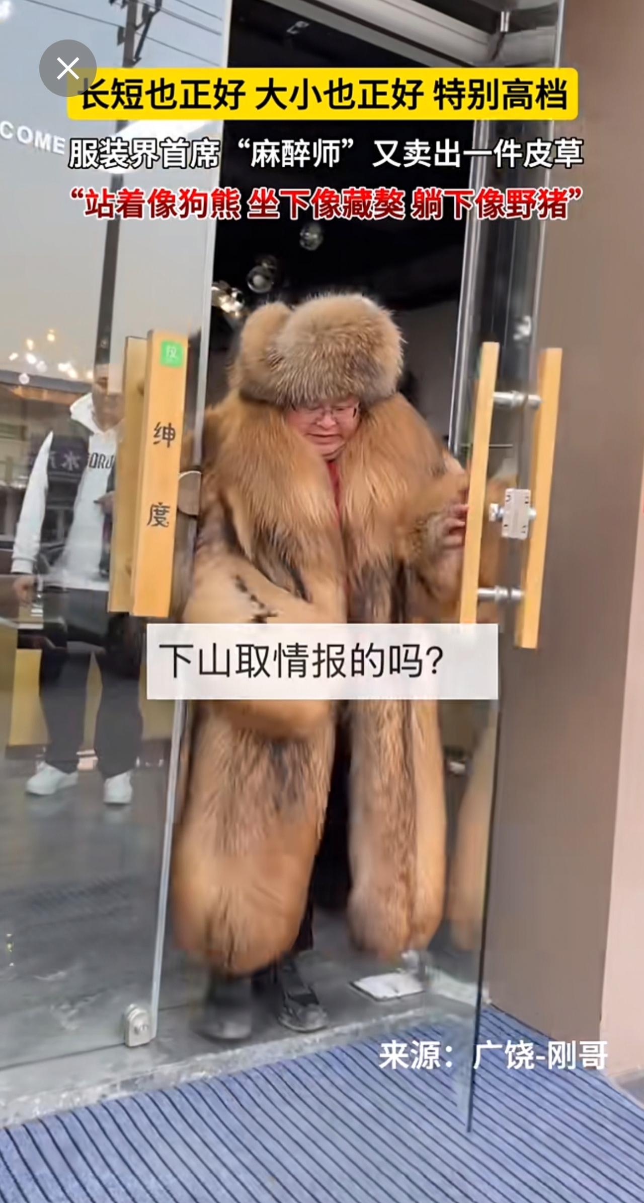 长短也正好,大小也正好,特别高档。服装界首席“麻醉师”又卖出一件皮草~“站着像狗熊,坐下像藏獒,躺下像野猪”[呲牙](来源:广饶-刚哥 )