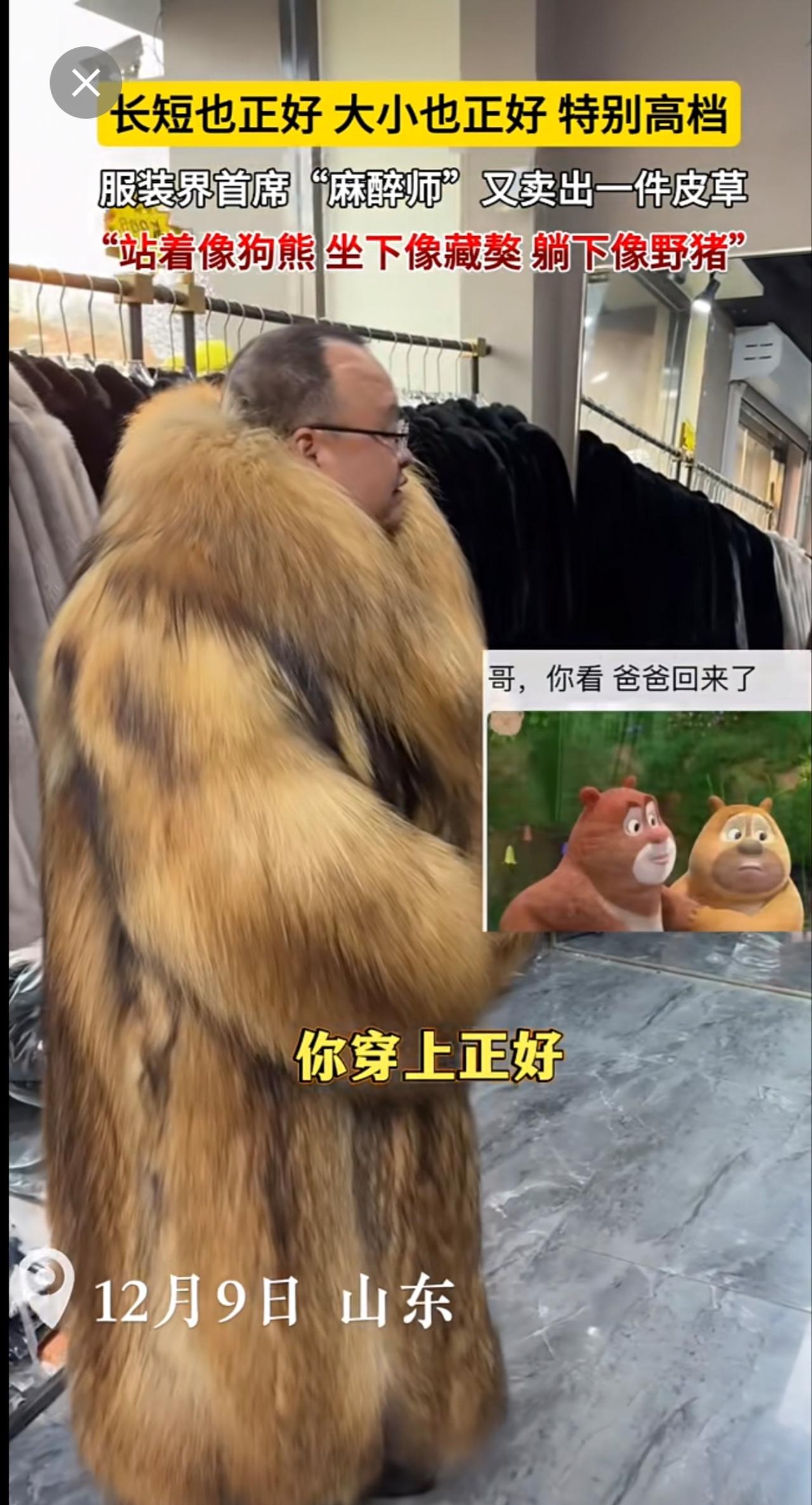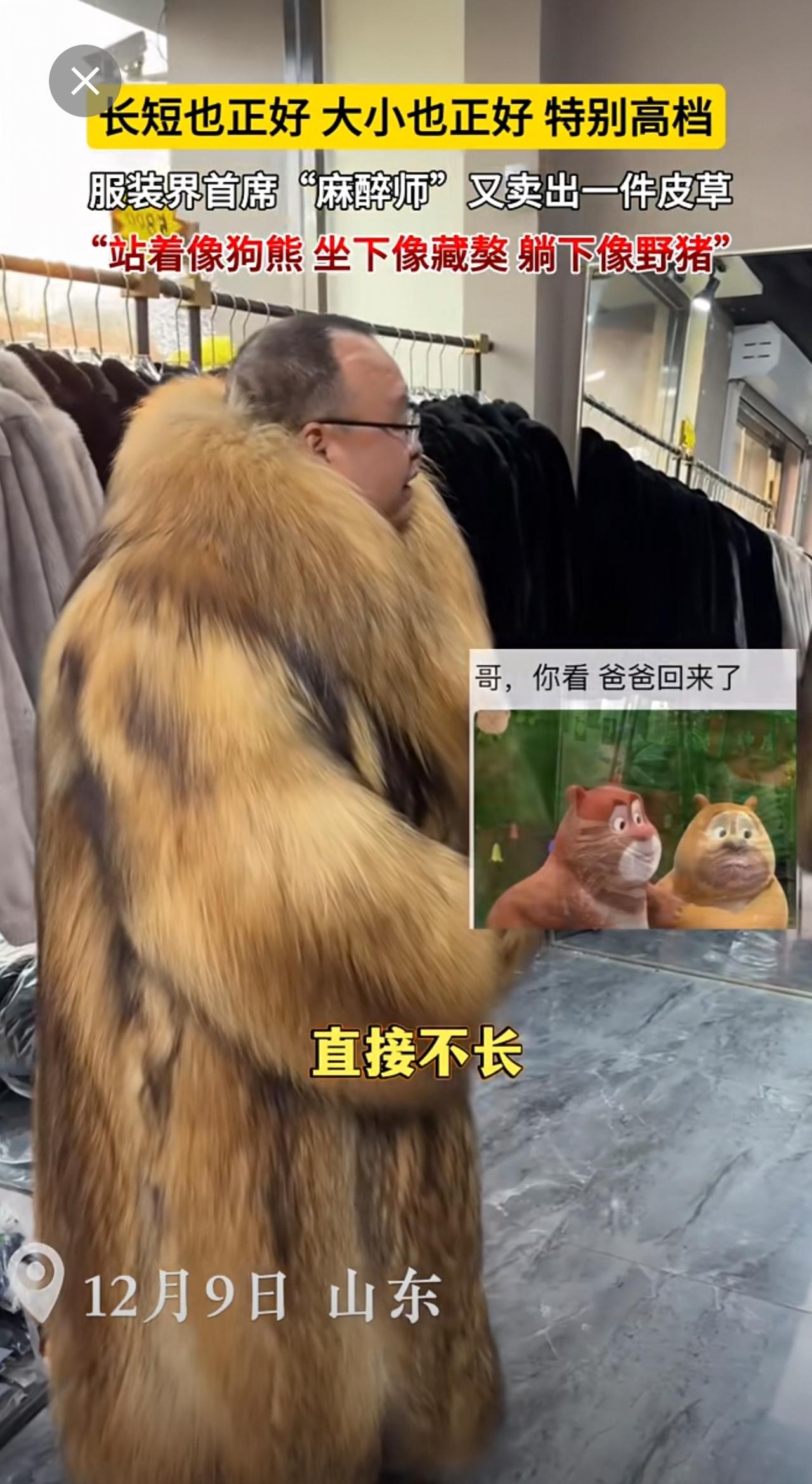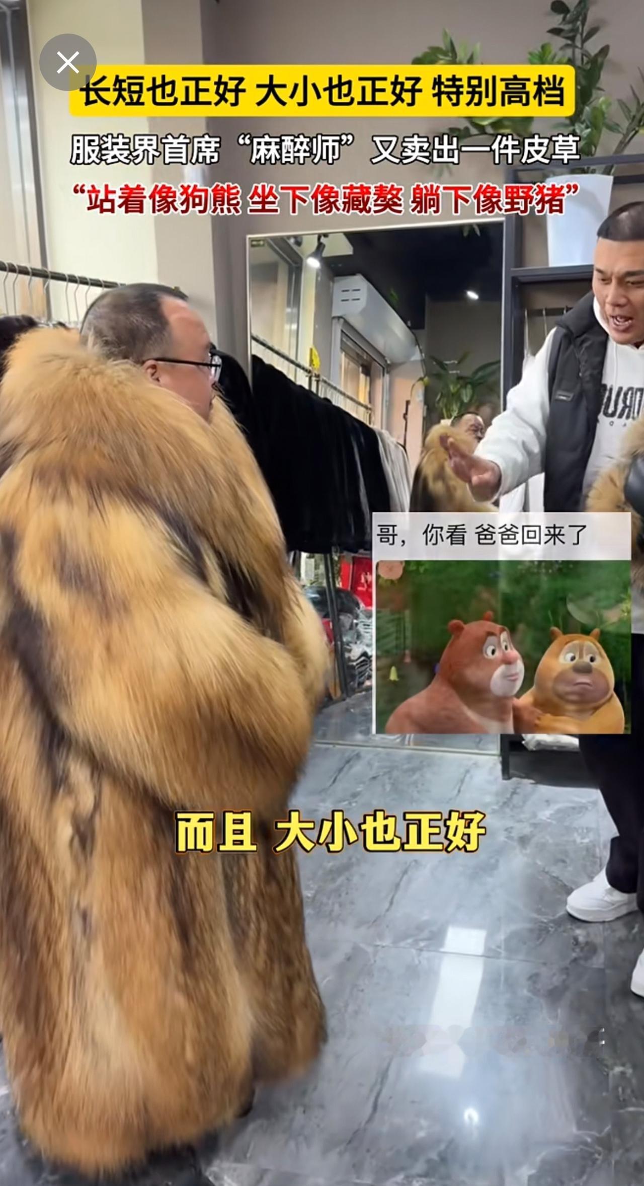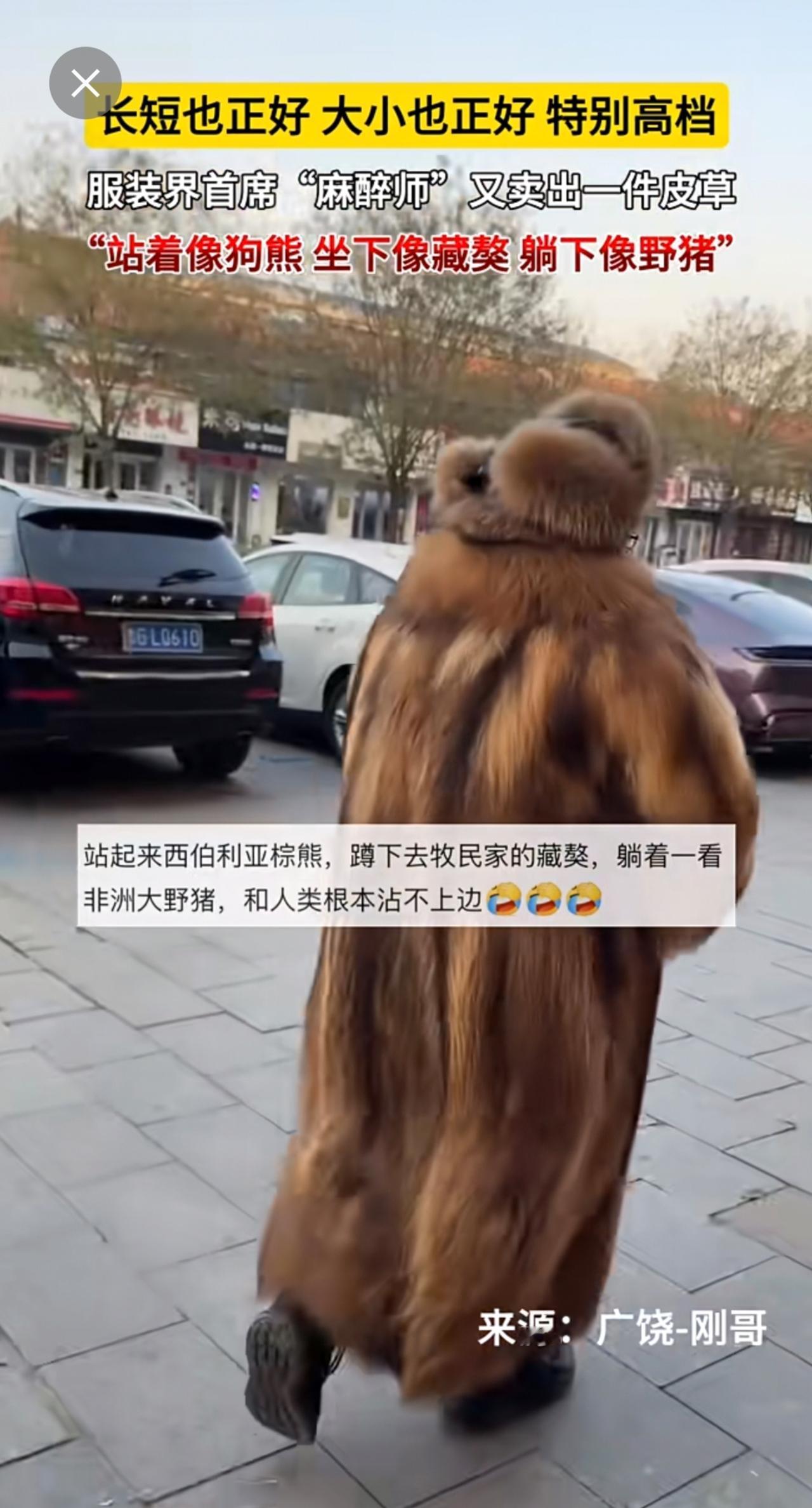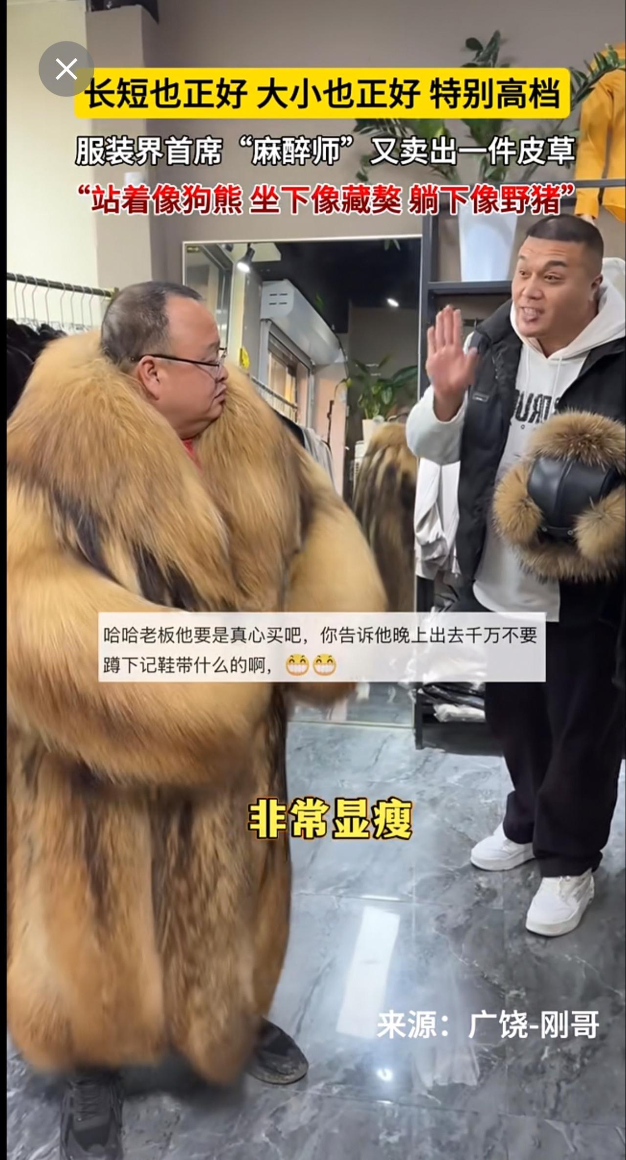 长短也正好,大小也正好,特别高档。服装界首席“麻醉师”又卖出一件皮草~“站着像狗熊,坐下像藏獒,躺下像野猪”[呲牙](来源:广饶-刚哥 )