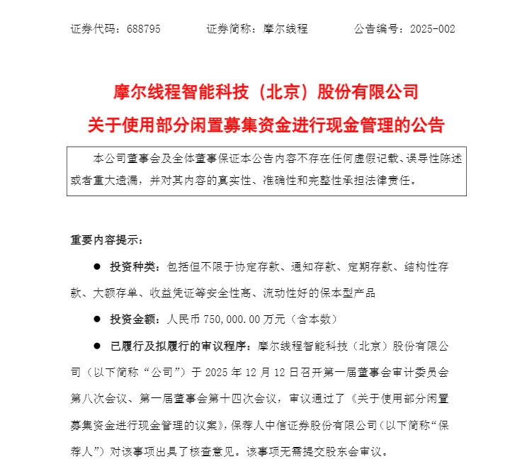 红星资本局12月13日消息,12月12日晚间,摩尔线程(688795.SH)发布公告称,公司将使用部分闲置募集资金进行现金管理,计划使用资金不超过75亿元,使用期限在12个月内有效。在上述额度及期限范围内,资金可以循环滚动使用。公告披露引起关注。