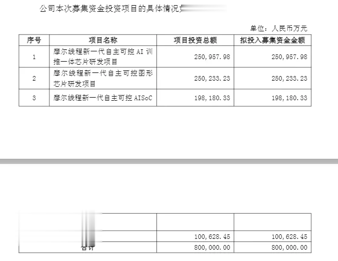 按照此前计划,摩尔线程拟募资80亿元,将投向以下项目:25.1亿元用于摩尔线程新一代自主可控AI训推一体芯片研发项目,25.02亿元用于摩尔线程新一代自主可控图形芯片研发项目,19.82亿元用于摩尔线程新一代自主可控AISoC芯片研发项目,10.06亿元用于补充流动资金。