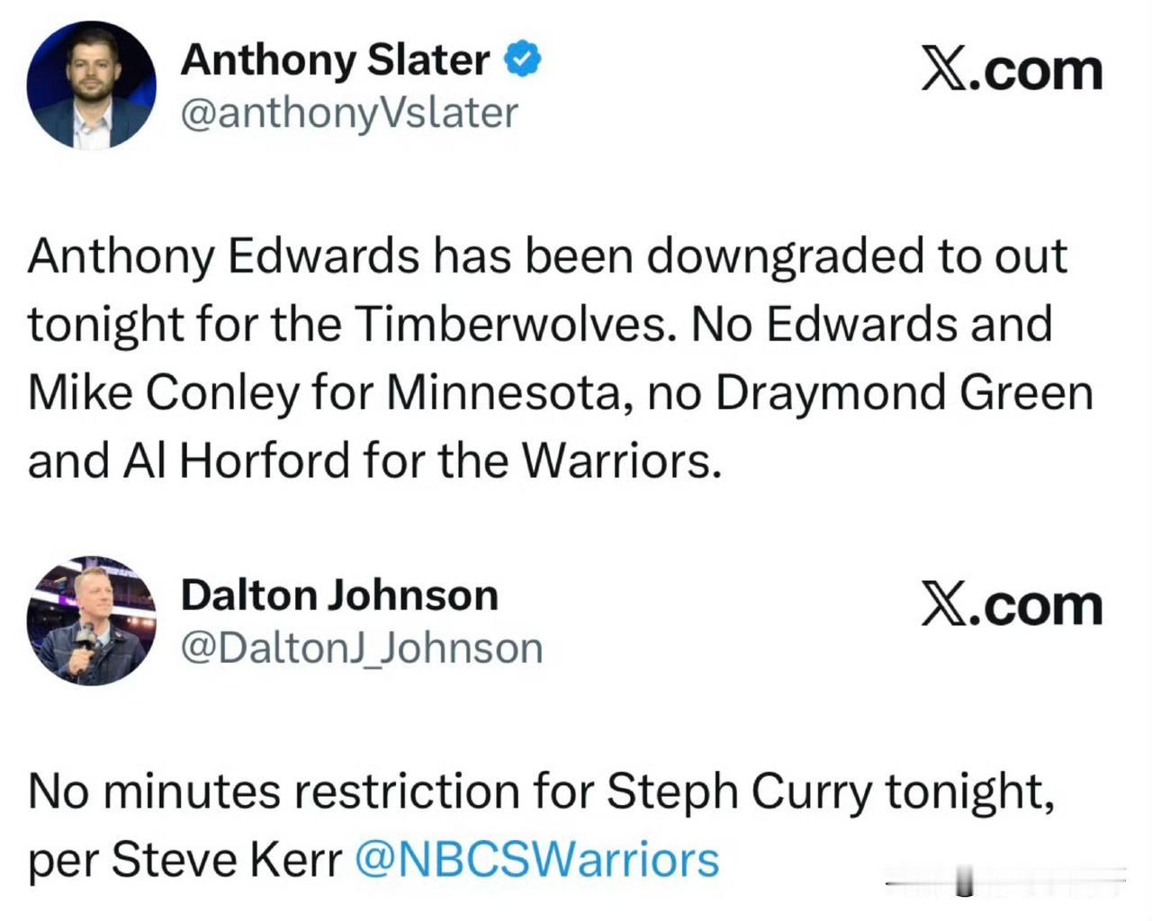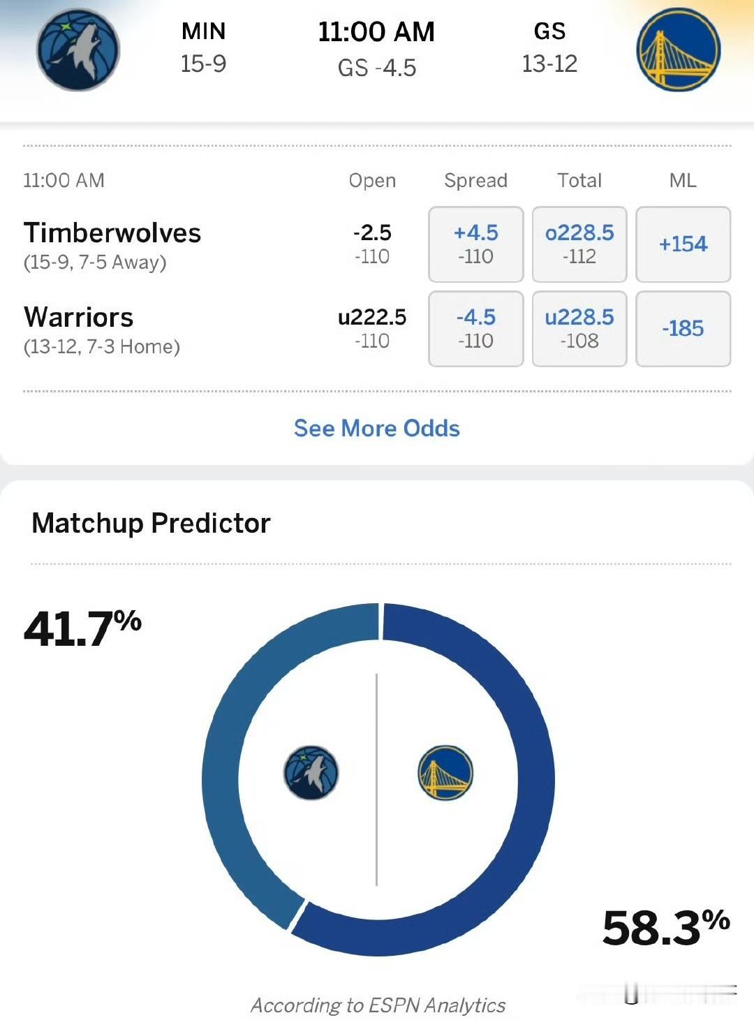 库里复出战森林狼!!!爱德华兹,康利、追梦-格林、霍福德缺阵,勇士被看好! 北京时间今天周六,勇士主场迎战森林狼,此役库里选择复出,而追梦、华子、霍福德和康利等人缺阵。 库里终于康复了,接下来他们的赛程相对简单一些,对于勇士还是相对有利的,勇士最近艰难的赛程但是他们的排名却很稳定,基本上一直稳居第八。 森林狼今天爱德华兹和康利不打,无论是持球还是进攻端都下降了不少,而且是客场作战,压力不小啊。 目前ESPN给出的预测中显示,勇士有接近6成的概率可以拿下本场比赛,还是非常被看好的。 勇士主场也是-4.5,格林缺阵对勇士影响也不小,所以双方其实差距不会太大。 勇士队 库里 追梦格林 勇士赛程 金州勇士 森林狼