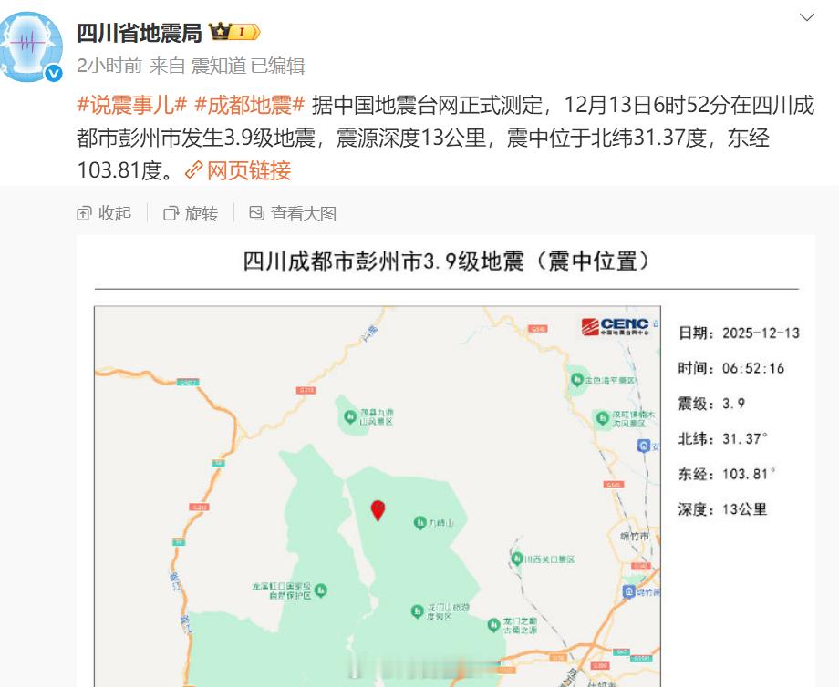 成都地震 据中国地震台网正式测定,12月13日6时52分在四川成都市彭州市发生3.9级地震,震源深度13公里,震中位于北纬31.37度,东经103.81度。