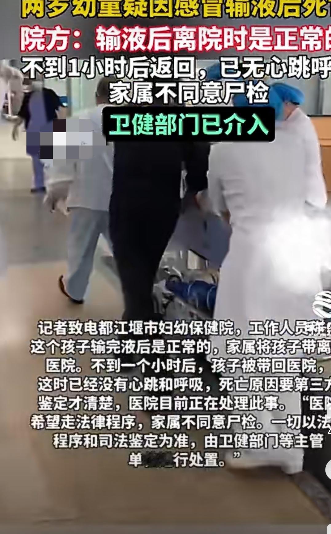 2岁男童输液后离世,这事也太让人揪心了 四川都江堰这事儿真的越看越五味杂陈!2岁娃得甲流去妇幼保健院输液,输完好好的,家属签字带离后不到一小时,又抱着没心跳呼吸的孩子返院,最终没能抢救回来。 医院说初步怀疑是呕吐物窒息,想走法律程序做鉴定,可家属死活不同意尸检,反倒要500万赔偿。更让人难接受的是,他们还把孩子遗体暴露在外博关注,完全不管甲流有传染性该妥善存放。 好好的娃没了本就让人痛心,可家属这操作实在让人看不懂。现在卫健部门已经介入,希望能尽快查明真相,也给孩子一个公道,别让悲剧再添闹剧。