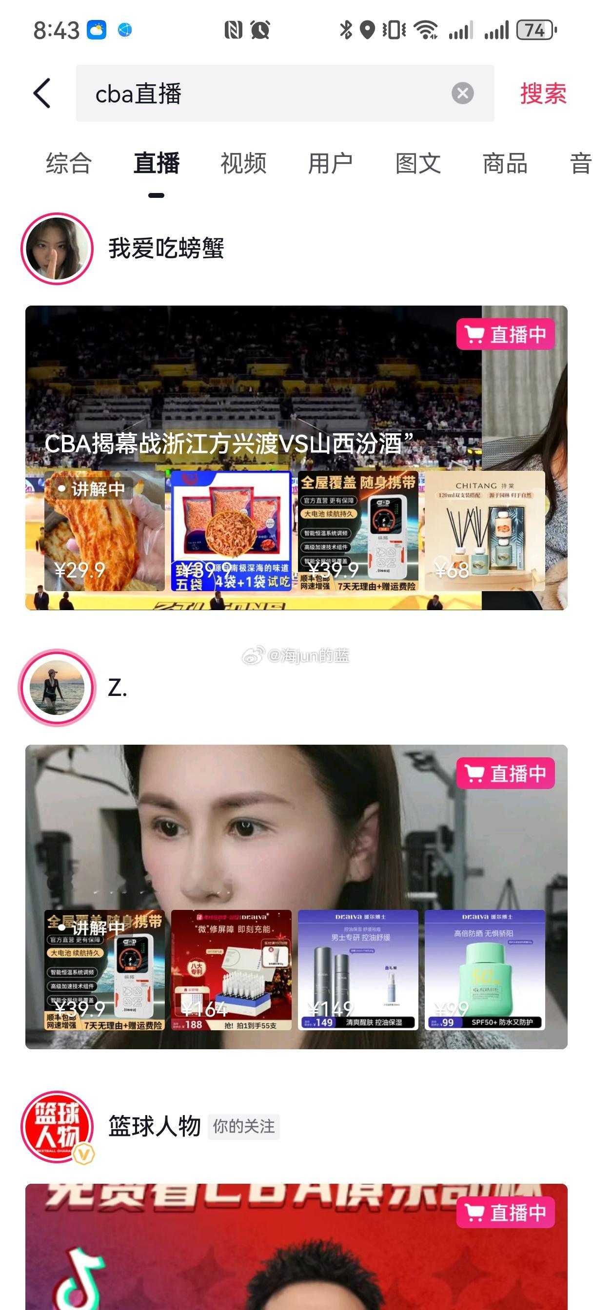 不知道昨天有多少人看了揭幕战,你们都用的哪个平台?央视频?还是抖音?我昨天尝试用抖音看了直播,发现它们真是把流量玩明白了。抖音授权达人直播没问题,毕竟有些达人流量并不低,比如退役球星孟铎、贺天举,以及网红博主二龙湖贾队长等人,他们本身就有巨大的粉丝群体;抖音在直播的时候让主播带货也没问题,毕竟玩的就是“免费换流量,流量换销量”的套路。但是你让一些粉丝只有一两千的不懂球的女模特主播播篮球是几个意思?点进去这些女主播主页,全都是擦边视频,所以抖音这是认为看CBA的篮球迷,要不是血气方刚的小伙子要不是上了年纪的老色批?才让擦边主播来吸引他们的眼球和流量?行,就算如此,你找几个稍微懂点篮球基本常识的女主播也行啊,结果这些女主播是一句关于比赛的内容都没有,要不是直接介绍小黄车里的商品,要不就是“感谢哥哥送的小心心,没点关注的点个关注,有条件的上个灯牌哈,谢谢哥哥”,还有个别的没素质球迷在借用“持球”“运球”等词语或露骨的话故意调戏女主播。你不得不佩服抖音这些运营,他们是真懂怎么收割流量啊。CBACBA新赛季揭幕战广厦男篮vs山西男篮 CBACBA潜力赛来了