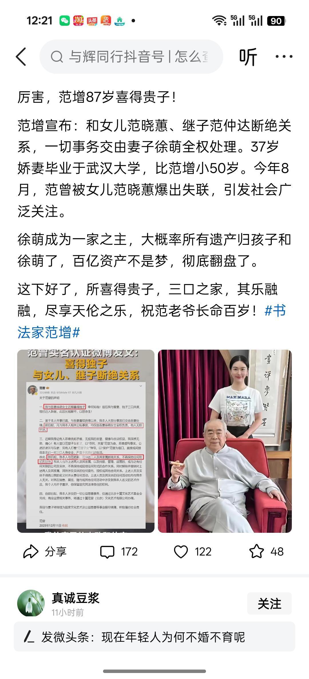 白活了八十多,被年轻小娇妻套牢,居然公布与亲生女儿断绝关系,这女的是怎么灌的失魂汤,让范曾如此迷失心智?一声叹息