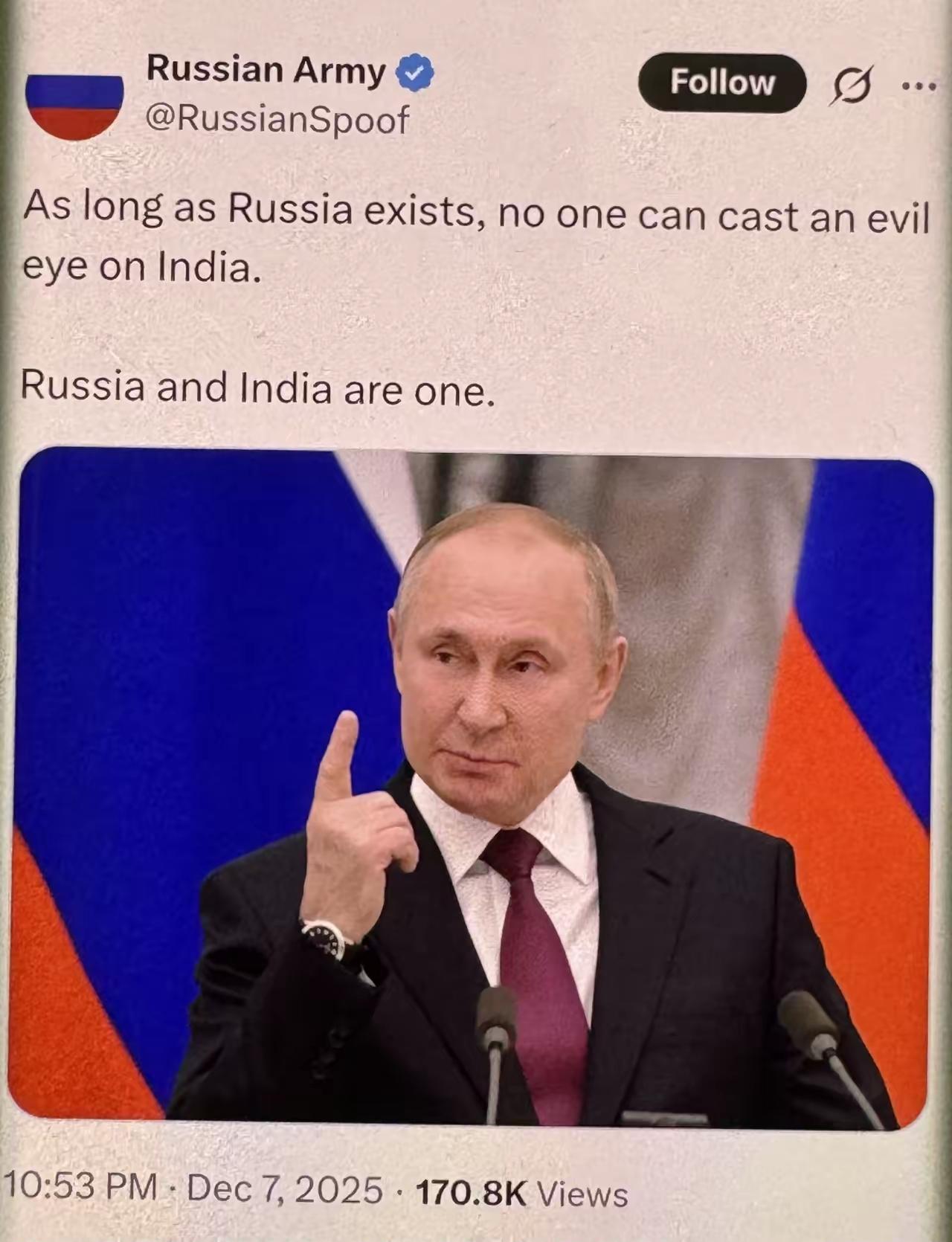 印度才是赢家啊。 普京在访问印度后,说出了这样的话:只要有俄罗斯在,就不允许别人用恶意的眼睛看印度,因为印俄一家亲。 这话是说给谁听的呢?虽然俄罗斯的话就跟废气一样,说过了就也不认。但想想俄罗斯之前卖印度武器,卖菲律宾武器,就觉得俄罗斯人心里很清楚自己想要跟谁是朋友。 其实,关于俄罗斯的战略设想,只要看看普京的精神导师杜金的书就够了。一切都明了了。普京正是在实践杜金的构想。