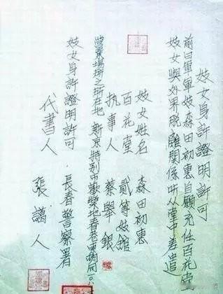 日本军妓,日本国内也称女子义勇队,有证。她们的工作场所,随日军推进速度和战场变化而变化。 日本女人主动当军妓主要有三种原因: 1,大日本荣光,圣战精神鼓动。 2,农村贫民妻女。 3,“国防妇人会”组织的城市女子。 军妓可以申请转化为民妓。图3是一张新京(长春)伪警局的妓女许可证,军转民。 其实,日本女人的战争狂热性一点不亚于日军。 日本