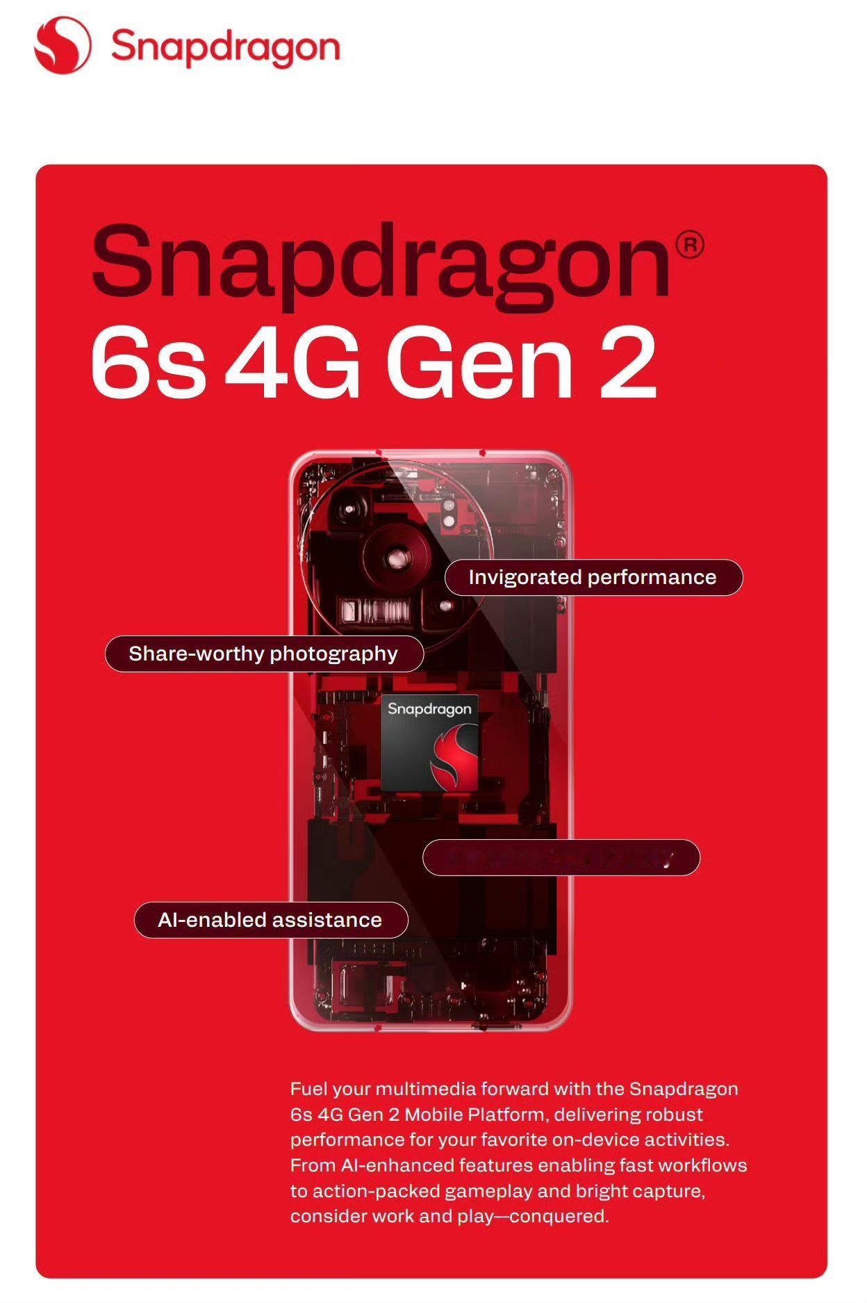 高通针对4G中低端市场推出骁龙6s Gen 2和骁龙4 Gen 4处理器。 骁龙6s Gen 2采用LPDDR4X内存和UFS 2.2存储组合,相比于前代芯片,CPU性能提升51%,GPU性能提升20%,荣耀X8d将搭配该处理器。 骁龙4 Gen 4采用4nm工艺制程,CPU为2个大核+6个能效核设计,采用LPDDR5+UFS 3.1存储组合,主打高能效与快速充电技术,支持5G双模。