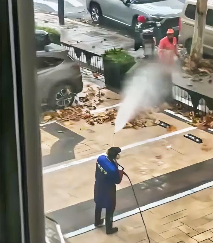 环卫工VS清洁工,这次我站环卫工。 冬天来了,路边树叶掉落,引发了环卫工和停车场清洁工的纠纷。 清洁工为了图省事,拿着水枪冲刷地面,顺便把落叶全都冲到了栅栏外的甬道上,结果刚好被环卫工发现。 环卫工一看这还得了?本来自己已经清扫过的甬道,让清洁工又给弄脏了,待会扣钱了咋整? 于是骂骂咧咧的用手把落叶抱起,又顺着栅栏上方丢回了停车场。 两个人你来我往,搞得停车场里外狼藉一片,好在没动手。不过毕竟清洁工用的是水枪,环卫工有些吃亏,根本斗不过他。 要说这清洁工有些欺负人了,落叶这东西落到谁家就该归谁打扫,自己投机取巧,把压力转移给环卫工。 你用水枪轻轻一冲几秒钟打扫完毕,结果环卫工需要辛苦一个小时,还有可能被扣工资,如果互换角色,你肯定也不高兴,所以做人不能太自私。