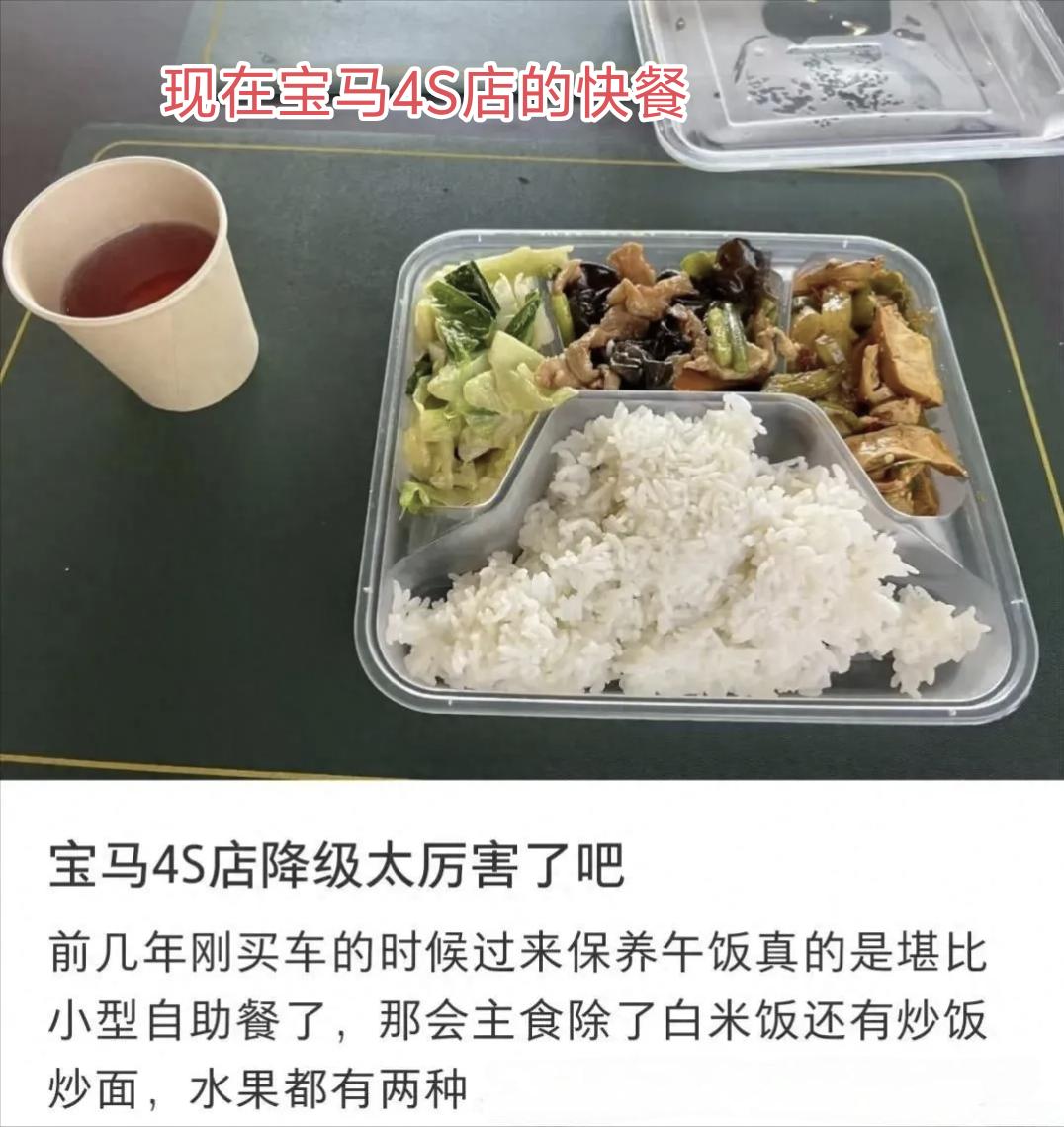 说实在,不用看什么周销量榜单月销量榜单,看看各家4S店免费提供给车主的餐食,就可以知道谁的生意好不好了。 看鸿蒙大饭店的,三菜一汤水果饮料是标配,海鱼大虾也寻常。而且免费吃,每天不重样。 再看B BA和友商的,一顿比一顿瘦身还不算,盒饭、泡面、快餐也惊喜。 从餐食的丰富度、规格、类型来看,各汽车品牌的餐食梯度差异真的很明显。 鸿蒙大饭店餐食都是搭配精致的套餐形式,包含主食米饭、多种荤素菜肴、汤品、水果,摆盘讲究且品类丰富,丰富度是所有品牌最高的。 再看B BA—— 以前的奥迪4S店,提供自助餐形式的餐食,以热菜为主,菜品数量多、品类全(如荤素小炒),属于正餐级别的丰富配置,整体规格较高。而现在的奥迪4S店 餐食简化为点心(糕点)、水果拼盘+饮品的组合,无正餐类菜品,对比从前的自助餐,丰富度和规格大幅下降,仅为简餐水准。 现在的宝马4S店,提供塑料餐盒分装的快餐,包含米饭+少量荤素菜,是基础的简餐配置,对比其此前“堪比小型自助餐”的标准,降级明显,丰富度远不如过去。 其他友商4S店,有的居然仅提供桶装方便面+少量零食,无正餐类餐食。甚至有的只是随便给到店车主点一份十几二十块钱的盒饭,和鸿蒙大饭店相比,真的高下立见。 这个现象说明什么?当品牌经营遇困,4S店首先想到的是削减“非必要开支”,波及餐食等服务配置,进一步拉低餐食规格。 而华为切入新能源汽车赛道后,按照华为的标准,完全改变了行业玩法,鸿蒙大饭店、AlTO等门店把餐食做成特色招牌,将门店打造成用户愿意停留的“第三空间”,以此维系长期用户关系。这种模式倒逼传统4S店面临两难:跟进吧,高规格餐食会增加成本。不跟进吧,又会让用户体验差距更明显,真是左右为难啊!华为入局智驾的鲶鱼效应 你觉得华为五界合体后竞争力如何