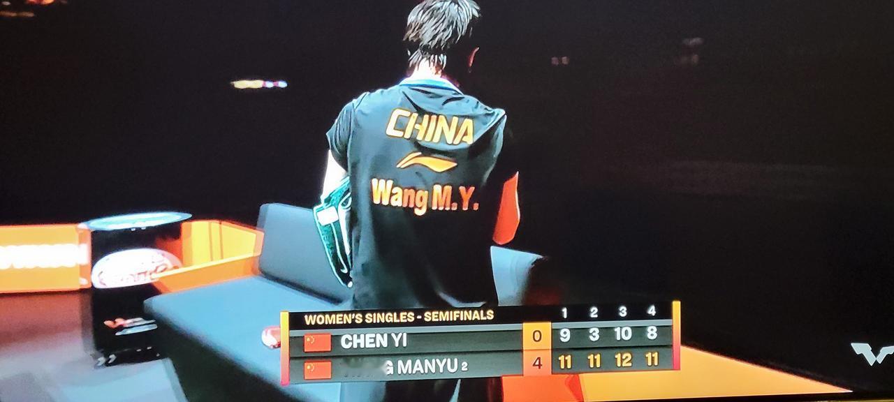 曼昱4:0战胜陈熠,决赛将与大丫头争夺金牌! 果然不出大家所料,曼昱击败陈熠晋级决赛。 曼昱赢在功底十分厚实,攻防兼备,男子化的打法极其明显,无论是前三板还是相持球均技高陈熠一筹,像一道钢铁长城打不穿。 不过,陈熠有三局和曼昱缠斗很凶,比分胶着,打得也十分棒,只是可惜遇到了曼昱这道难以逾越的钢铁长城。