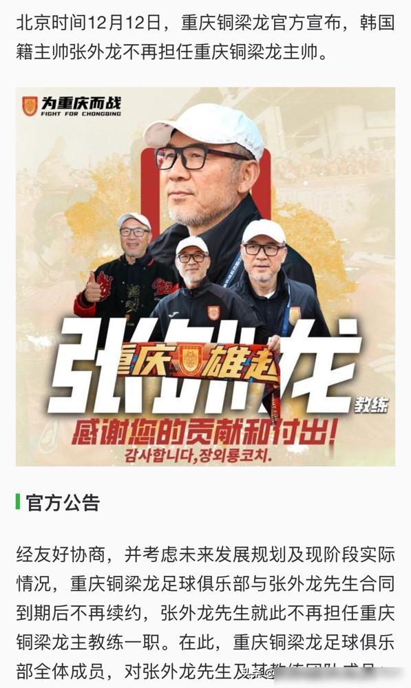一切均不是空穴来风! 昨天重庆铜梁龙正式官宣张外龙离任,今天中甲定南赣联也官宣