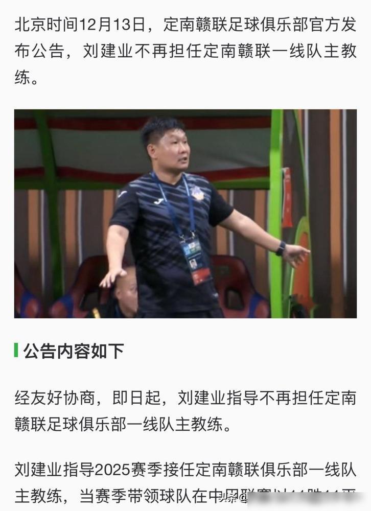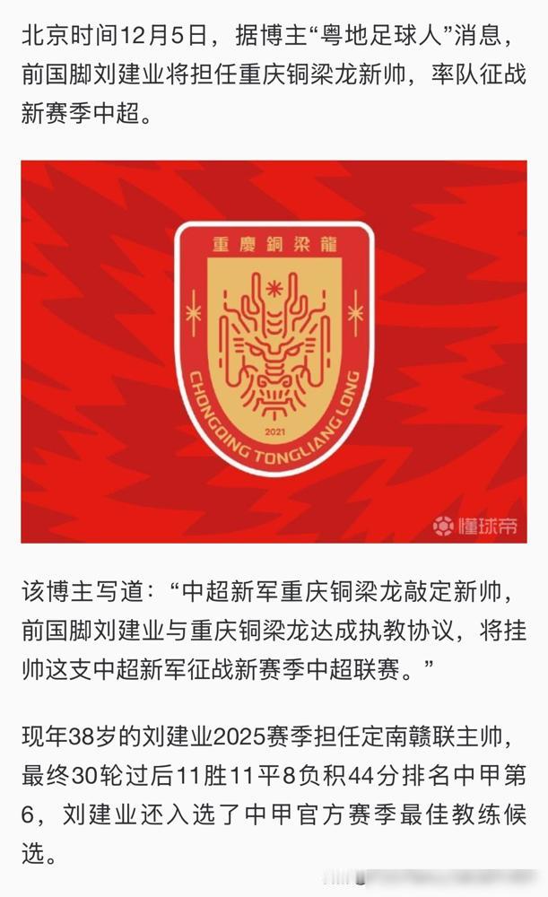一切均不是空穴来风! 昨天重庆铜梁龙正式官宣张外龙离任,今天中甲定南赣联也官宣刘建业不再担任球队主教练,一切就是按部就班的开始了? 一切都不是巧合,而是风暴来临前的气压变化。 新赛季的中超赛场,我们真的要看到一位仅有一年中甲执教经验的少帅,掌舵这支充满血性的升班马吗? 说实话,这步棋走得足够大胆,甚至有些冒险。 张外龙是谁? 他是亲手将重庆铜梁龙从中甲带到中超的功勋舵手。 三十轮联赛,六十分积分,一个沉甸甸的亚军,直接敲开了顶级联赛的大门。 这位韩国教头早已用成绩赢得了山城球迷的心,他的告别,注定伴随着无数的不解与叹息。 俱乐部在成功冲超后选择换帅,这“过河拆桥”的议论声,怕是轻易不会散去。 视线转向事件的另一位主角,刘建业。 球员时代,他是跑不死的铁腰,是国家队的常客,履历光鲜。 但教练席与绿茵场,完全是两片天地。 他独立执教的答卷,是上赛季带领定南赣联取得11胜11平8负,积44分排名中甲第六。 这份成绩单,对于一支中甲球队而言,堪称稳健,甚至让他跻身最佳教练候选,足以证明其潜力。 但中甲第六与中超赛场之间,隔着的可不仅仅是联赛名称的差异,那是强度、压力、竞争环境的全面升级。 我们不禁要问,重庆铜梁龙看中的究竟是什么? 是刘建业身上那股初生牛犊不怕虎的锐气,还是近年来前国脚转型教练的“成功模板”? 于根伟在天津、邵佳一在青岛西海岸乃至国家队,陈涛、邓卓翔等人都在教练岗位上展现了才华。 俱乐部或许正期待着刘建业能复制这条路径,用年轻的思想和熟悉的国内足球人脉,为球队注入新的活力。 但模板可以借鉴,成功却无法粘贴。 邵佳一的成功背后是具体的战术构建与临场指挥,并非“前国脚”这个头衔的必然结果。 对于刘建业而言,这既是机遇,也是巨大的挑战。 从中甲中游球队一跃成为中超新军的主帅,他需要适应的不仅是更强的对手,还有来自球迷更高的期待和更苛刻的目光。 他的战术库是否足够丰富? 临场调整能否跟上中超的节奏? 这些问号,都需要用一场场硬仗来拉直。 重庆铜梁龙的球迷们,此刻心情定然复杂。 他们感激张外龙带来的辉煌,又不得不对新帅抱以期待,这种期待里,掺杂着担忧与希望。 中超的舞台已经搭好,聚光灯即将打在刘建业和重庆铜梁龙身上。 是上演一出“青出于蓝”的励志大戏,还是在高强度的对抗中陷入挣扎? 这场豪赌的结果,只有时间能给出答案。 但可以肯定的是,新赛季的中超,因为这笔充满话题性的换帅,注定会多出一份别样的看点。 山城的球迷,准备好了吗? 这场风暴,才刚刚开始。