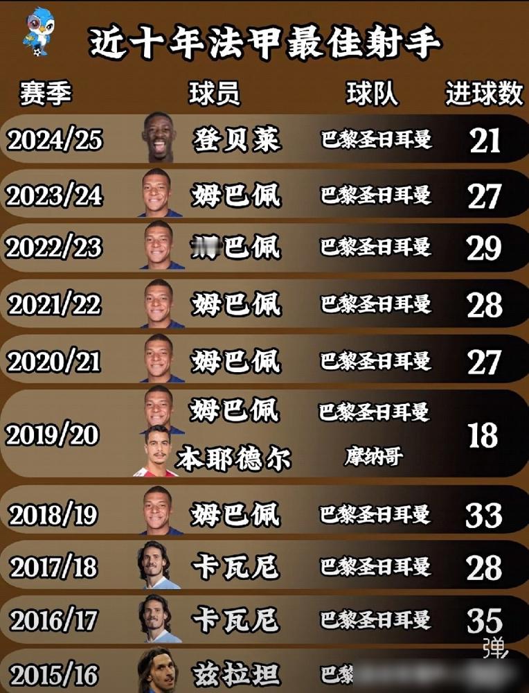 姆总霸榜射手榜! 近十年法甲最佳射手王, 24/25赛季, 登贝莱-大巴黎-21球 23/24赛季, 姆巴佩-大巴黎-27球 22/23赛季, 姆巴佩-大巴黎-29 球 21/22 赛季, 姆巴佩-大巴黎-28 球 20/21 赛季, 姆巴佩-大巴黎-27 球 19/20 赛季, 姆巴佩&本耶德尔-18 球 18/19赛季, 姆巴佩-大巴黎-33球 17/18赛季, 卡瓦尼-大巴黎-28球 16/17赛季, 卡瓦尼-大巴黎-35球 15/16赛季, 兹拉坦-大巴黎-38球 姆总连续5年金靴,你受得了吗...姆总统治级霸榜! 从18/19赛季那个横空出世、单季狂轰33球的年轻人,到之后连续五个赛季将金靴奖变成私人收藏的绝对核心,这种统治力近乎霸道。 即便在19/20赛季与本耶德尔共享荣誉,也丝毫无法动摇他作为这十年法甲射手王的唯一主角地位。 想想看,十年里有六个赛季的射手榜顶端刻着他的名字,这是一种怎样的存在? 当梅西和内马尔这样的超级巨星来到王子公园球场,聚光灯下,最稳定的终结点依然是姆巴佩。 他用自己的方式定义了巴黎圣日耳曼的一个时代,255个进球让他稳坐队史射手王宝座,六座法甲冠军和四次联赛最佳球员奖杯则是这段辉煌岁月的最佳注脚。 他不仅仅是在进球,更是在书写一段属于自己的传奇。 然而,所有的传奇篇章都有翻过去的一页。 随着姆巴佩开启职业生涯的新旅程,法甲的射手榜仿佛瞬间进入了一个“后姆巴佩时代”。 看看刚结束的24/25赛季,登贝莱以21球穿上金靴,这个数字放在姆巴佩垄断的年份里,可能只是争夺者而非终结者。 格林伍德同样打入21球,紧追不舍。 射手榜呈现出一种群雄并起、却无人能绝对服众的新局面。 一个时代真正的重量,往往是在它结束之后才被更深刻地感知。 这种对比足够残酷,也足够清晰。 姆巴佩在法甲留下的,不只是一连串冰冷的数字,更是一座衡量顶级射手的新标尺。 他18/19赛季的33球、22/23赛季的29球,展现的是一种持续而恐怖的输出能力。 如今,射手榜的竞争似乎更加“平均”,悬念重生,但对于看惯了姆巴佩那种“一览众山小”表演的球迷而言,这份热闹背后,总感觉少了一点什么。 那是属于超级巨星的独特气场,是能将个人表现升华到定义联赛高度的统治力。 法甲的历史会永远记住基利安·姆巴佩这个名字。 他用自己的青春和进球,为这个联赛打上了深深的个人烙印。 他的离开,标志着一个时代的终结,也开启了一个全新的、充满未知的竞争格局。 未来的金靴们可以更轻松地登顶,但他们要面对的追问是,你能达到姆巴佩曾经的高度吗? 这个问题,将成为悬在每一位新科射手王头顶的达摩克利斯之剑。