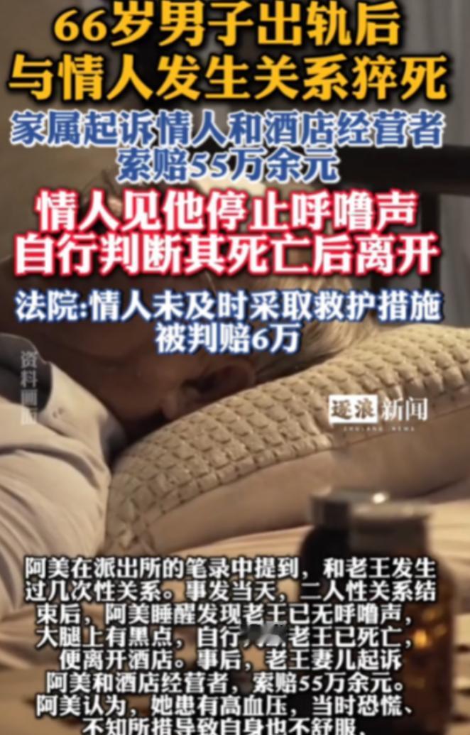 广西一66岁男子和情人约会,不料,2人一番运动之后,男子突然没了动静,一开始,女方以为男子睡着了,后来却发现男子没了呼吸,断定男子死了,于是就穿衣离开了,1小时后女子返回,带着酒店工作人员,确认男子已经死了很久了。男子家属把女子告上法庭,索赔55万,法院判了。 2024 年 7 月,66 岁的退休老人王某,和老同事阿美约在了广西一家酒店见面,说起来两人年轻时就差点成了恋人,2023 年偶然重新联系上后,几十年的未了情愫一下子被点燃,大半年里微信聊得火热,电话也没断过,这场酒店之约,在两人看来本该是浪漫的重逢,谁也没料到会变成生命的终点。 当天在酒店里,两人一番亲密相处后,王某便躺下休息,阿美也渐渐睡去,不知过了多久阿美睡醒过来,发现身边的王某一动不动,起初她没太在意,还以为王某只是睡得沉。 可喊了几声没回应,伸手一探,才惊觉王某身体发凉,连呼吸都没了,这一下阿美彻底慌了神,脑子里一片空白,满是恐惧,压根没想着要确认王某是不是还有救,也没想起要打 120 急救电话,只想着赶紧逃离这个让人害怕的地方。 她慌乱地穿好衣服,没敢多停留一秒,匆匆离开了酒店房间,就这么一走便是整整一个小时。这一个小时,对躺在床上的王某来说,是可能挽回生命的 “黄金时间”,可对阿美而言,却是用来逃避恐慌的煎熬时刻。 或许是良心实在过意不去,又或许是害怕事情闹大,阿美最终还是折返回到了酒店,找到工作人员后,才一起重新打开了那个房间的门。 可一切都晚了,工作人员赶到时,王某早已没了任何生命迹象,身体都已经僵硬,显然已经去世很久了,好好的一场约会,最终以这样的悲剧收场,王某的家属得知消息后悲痛欲绝,他们无法接受亲人就这么突然离世,更无法原谅阿美在关键时刻的 “见死不救”,在他们看来,若不是阿美当时只顾着逃跑,及时呼救或拨打急救电话,王某说不定还有生还的可能。 愤怒之下王某的家属将阿美告上了法庭,提出了 55 万元的巨额索赔,要求她为自己的行为负责,法庭上,阿美也道出了自己的苦衷,她说当时刚睡醒,脑子一片混乱,实在是太害怕了,一时间没了主意,还提到自己当时是回家吃降压药,并非故意不管王某。 但这些辩解,在法律的严谨考量面前,显得有些苍白,法官审理时明确指出,两人在酒店私密空间内发生亲密关系后,就形成了特定的 “先行行为” 关系,在那个封闭的环境里,阿美是唯一一个有能力、也有义务救助王某的人。 哪怕她不懂专业的急救知识,最起码也该第一时间联系酒店工作人员,或是拨打 120 求救,这是作为一个成年人最基本的责任,不能因为害怕就逃避。 不过法律也有着公正的考量,法院经过调查确认,王某已经 66 岁,自身存在基础疾病,他的猝死主要原因还是源于自身健康状况,不能把全部责任都推到阿美身上。 但阿美的逃离行为,客观上确实错失了可能救助王某的最后机会,导致损害结果无法挽回,她必须为自己的过错承担相应的责任。 最终法院没有支持家属 55 万元的索赔诉求,判决阿美赔偿王某家属 6 万元,至于涉事的酒店,因为当时房间处于私密状态,阿美没有呼救,工作人员无法强行进入查看,不符合经营场所安全保障义务的追责条件,所以没有被认定需要承担责任。 这起案件真的让人感慨万千,一段跨越多年的黄昏恋,本该是温馨的回忆,却因为一次自私的逃避,变成了无法挽回的悲剧。 阿美或许真的是一时害怕,但在生死关头,那句 “我吓坏了” 终究不能成为抛弃他人、独自逃离的借口,6 万元的赔偿金,比起一条生命来说微不足道,但它背后承载的,是法律对过错行为的惩戒,也是对生命的敬畏。 当两个人处于私密的亲密关系中,彼此就是对方生命的最后一道防线,在生与死的关键时刻,逃避解决不了任何问题,及时伸出援手哪怕只是一个求助电话,或许就能改变结局,而一时的恐惧和自私,可能会让人背负一辈子的道德枷锁和法律责任得不偿失。
