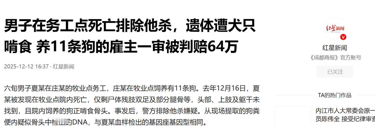 内蒙古一男子养了11条狗,这天他来看狗时,竟发现狗在啃骨头,而且很像是人骨,他意识到不对劲,自己此前雇了位60岁老人看护,现在老人却不见了!他仔细搜寻后发现,老人已经死了,遗体只剩双脚和部分腿骨,头、胳膊、躯干都不见了,男子赶忙报了警。民警排除他杀,从狗粪中检出和老人一致的DNA,老人家属起诉男子索赔64万,法院判了! 庄某于当地经营着一处独立牧业点,为防盗护院他先后养了 11 条犬,其中 4 条为大型犬,体型健硕,为图省事他仅将两只大狗拴住。其余九条犬只,不论体型大小,皆处于散养状态,于无围墙的庭院中肆意奔跑,无拘无束。 2024 年 11 月 19 日,他以每月 1500 元的工资,口头雇了 60 岁的夏某来牧业点干活,烧炉子、喂狗、看场子,都是夏老汉的活儿,二人未签订正规合同,夏某竟未携带身份证,连基础的意外保险亦未购置,谁能料到这看似平常的雇佣模式,在不足一月后便引发了一场大祸。 从 12 月 2 日之后,庄某就没再和夏某联系过,直到 12 月 16 日,大概是想起要给牧业点送点给养,或是惦记那群狗他才驱车赶过去。 刚到门口庄某就觉得不对劲,往常一靠近就会响起的犬吠声,这天竟一片死寂,推开门走进院子,眼前的景象让他瞬间僵在原地,11 条狗三三两两地扎堆在墙角和煤堆旁,正疯狂地争抢撕咬着什么,嘴角还挂着不明碎屑。 他鼓足勇气靠近煤堆,眼前景象令他寒毛直立、身子颤栗,地上横陈着一具残缺不全的遗骸,仅余双脚与部分腿骨,头、躯干和上肢难觅踪迹,破损衣物凌乱散在一旁。 庄某心里咯噔一下,立马想到了失踪的夏老汉,他颤抖着拿出手机报了警,脑子里一片空白,那个不愿相信的猜测,似乎已成了既定事实。 警方赶到后,立刻展开勘查,很快排除了人为他杀的可能,可后续的技术鉴定结果,让这场悲剧的残酷程度再升一级,法医从狗群排出的粪便,以及现场残留的骨骼碎片中提取了 DNA,经过比对,确认和夏某的 DNA 完全一致。 也就是说夏老汉真的成了自己照看的这群散养狗的腹中餐。这个结果传来,夏某的家属彻底崩溃了,亲人离世已是锥心之痛,遗体还遭到如此损毁,连最后的尊严都没能保留,这份痛苦实在难以承受。 人没了责任该谁负?夏某的家属一纸诉状将庄某告上法庭,索赔 64 万余元法,庭上庄某并不认可 “纵狗咬死人” 的说法,他坚持认为夏某年事已高,大概率是先突发疾病死亡,倒下后才被狗群啃食的,要是这样,这就是一场意外,他不该承担全部责任。 可法院的一审判决,直接戳破了他的侥幸心理,法官并没有纠结于 “夏某是先病死还是先被咬死” 这个无法完全验证的具体死因,而是直指庄某的 “无过错责任”,法官的逻辑很明确,不管夏某的直接死因是什么,庄某作为动物饲养人,把 11 条具有攻击性的犬只长期散养,还没采取任何隔离防护措施,本身就存在巨大过错,更关键的是他作为雇主,明知夏某独自在高风险环境下工作,却长达 14 天没有任何联系,完全不管不顾,这直接剥夺了夏某被及时救助的可能。 要是这 14 天里,庄某能打一个电话、跑一趟牧业点,或许夏某还有获救的机会,也不至于落得遗体被啃食殆尽的下场,这种对雇员安全保障义务的极端漠视,比狗的野性更致命。 最终法院判决庄某赔偿夏某家属共计 641237 元,其中包括 48 万余元的死亡赔偿金、12 万余元的丧葬费,还有 5 万元的精神抚慰金,法官特别提到,夏某的遗体遭到严重损毁,给家属带来了难以磨灭的精神创伤,这 5 万元精神抚慰金,是法律能给出的最直接的慰藉。 这起悲剧真的给所有人都敲响了警钟,庄某图一时方便,散养犬只、不签合同、不买保险、疏于管理,最后不仅要卖房凑赔偿款,一辈子都得背着这份愧疚,而夏老汉却为这份疏忽付出了生命的代价,连身后尊严都没能保住。 《民法典》里早就明确了动物致害无过错责任,只要是你的动物造成了损害,除非能证明是受害者故意招惹,否则主人就得担责。 那个空旷的牧业点,在这 14 天里究竟发生了什么,夏老汉在生命的最后时刻经历了怎样的恐惧,已经永远成了谜,但可以肯定的是,这起惨剧的根源,是庄某的懒惰与疏忽,是对生命的漠视。 这 64 万的赔偿款,对庄某来说是一笔天价学费,而对夏某和他的家人来说,却是永远无法弥补的伤痛,希望这个案子能让更多人警醒,不管是饲养动物还是雇佣他人,都不能心存侥幸,责任二字,容不得半点敷衍。 (信息来源:红星新闻——男子在务工点死亡排除他杀,遗体遭犬只啃食 养11条狗的雇主一审被判赔64万)