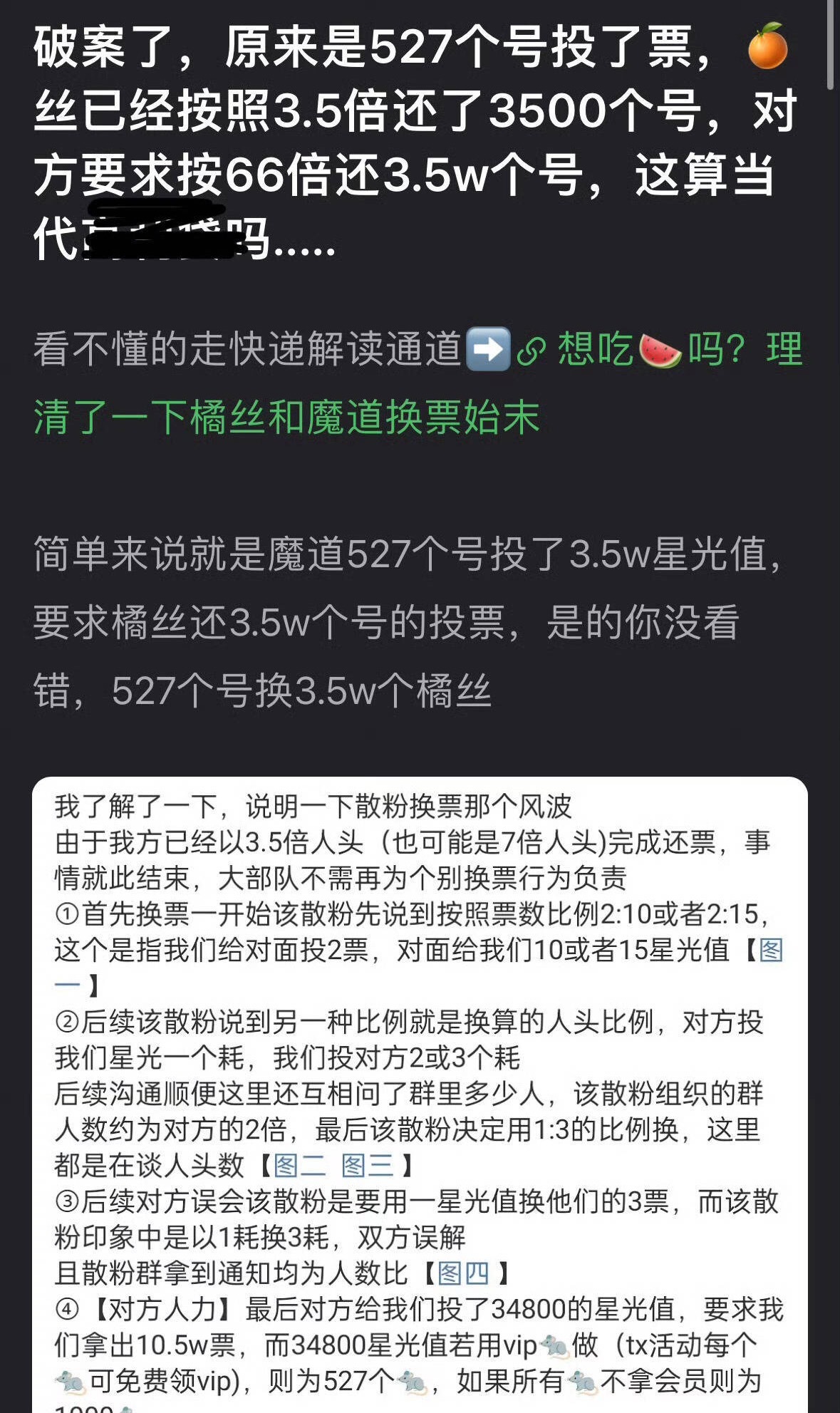 魔道祖师用星光大赏星光值和鞠婧祎家换微博之夜投票好像有争议,前两张图是魔道粉发的