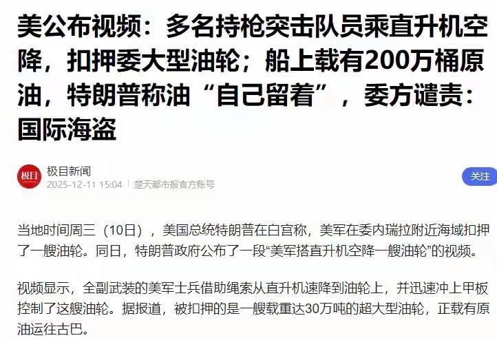 12月14日,据美国媒体报道,昨天,美国国务院新闻发言人莱维特宣布,12月10日被美国扣押委内瑞拉30万吨超大型油轮驶入美国休斯敦港口,由于这艘超大型油轮载有185万桶委内瑞拉重质原油无法停靠休斯敦港口,需要在近海锚泊后将油轮上重质原油卸载到小船泊进港。 评论,美国总统特朗普真是空手套白狼,不用一枪一炮抢劫委内瑞拉30万吨重质原油。 这出戏演的不怎么样?以打击“贩毒”为幌子,掠夺委内瑞拉石油才是真正的目的。 昨天,美国发言人讲,准备扣押委内瑞拉更多的油轮。 从美国在委内瑞拉近海一行一动,足以证明美国是一个十恶不赦海盗国家,光天化日之下明抢明夺,这就是帝国主义侵略者的“优越性”?[呲牙][呲牙][呲牙][呲牙][呲牙][呲牙]